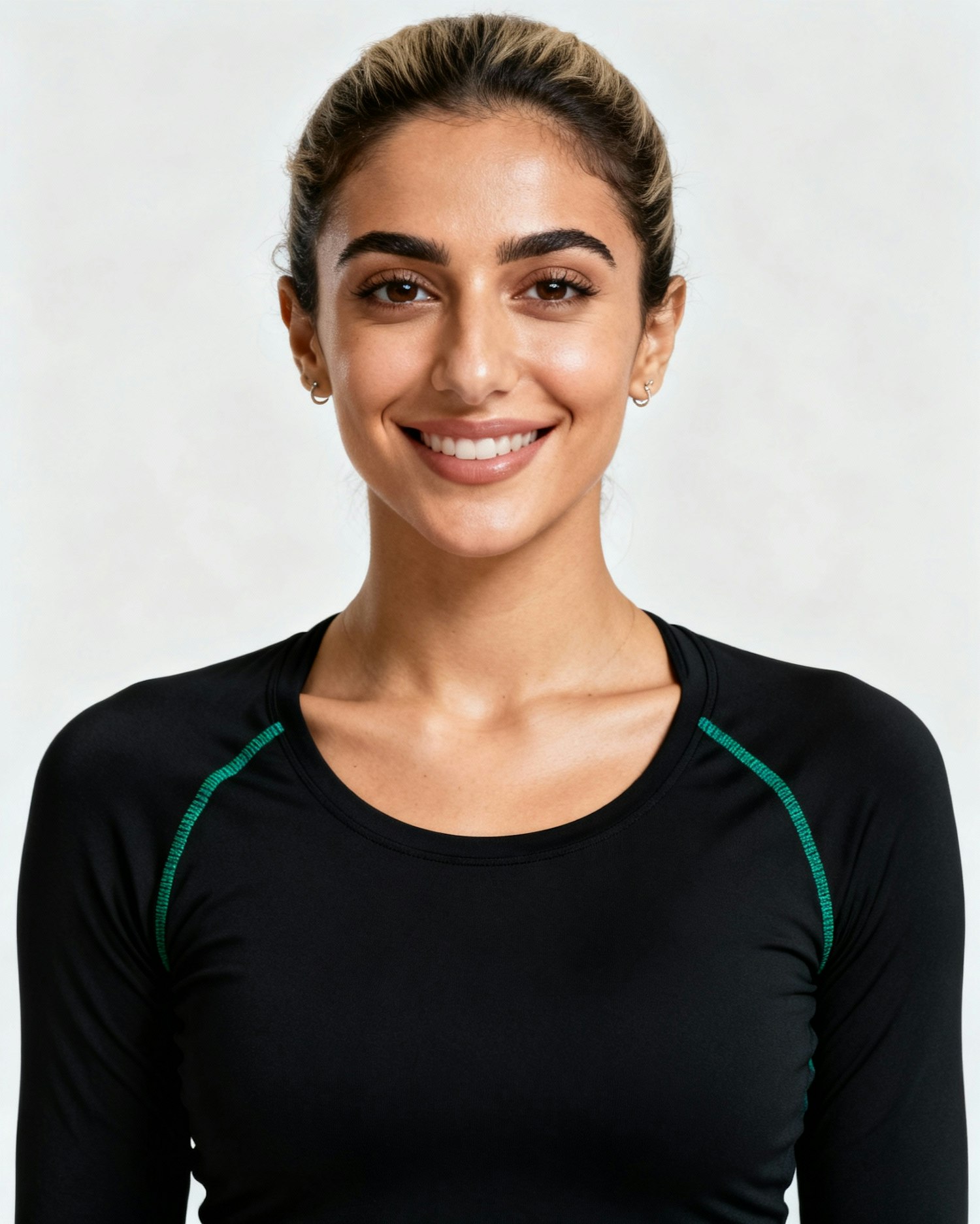 Studio portrait of a Turkish woman Pilates instructor, age 29; light-olive skin, neutral; black fitted long-sleeve with emerald thumb-stitch accent (non-branded). Neutral mid-gray seamless; clamshell soft key + gentle rim; crisp white light; 105 mm macro-sharp. Framing: head-and-shoulders, eyes to camera. Expression: poised, calm smile. Skin: luminous, lightly smoothed. Negative as above.Neutral mid-gray seamless backdrop; clamshell soft key + gentle rim; crisp white studio light; 105 mm macro-sharp detail. Framing: head-and-shoulders, eyes to camera. Skin: natural glow, lightly smoothed, no harsh retouch. Expression: warm, confident smile. Wardrobe system: non-branded black performance tops with subtle emerald accents (piping/zip/trim), charcoal bottoms; tidy grooming; simple small jewelry only. Negative: over-retouch, brand logos, watermarks, sweat stains, props, banding.