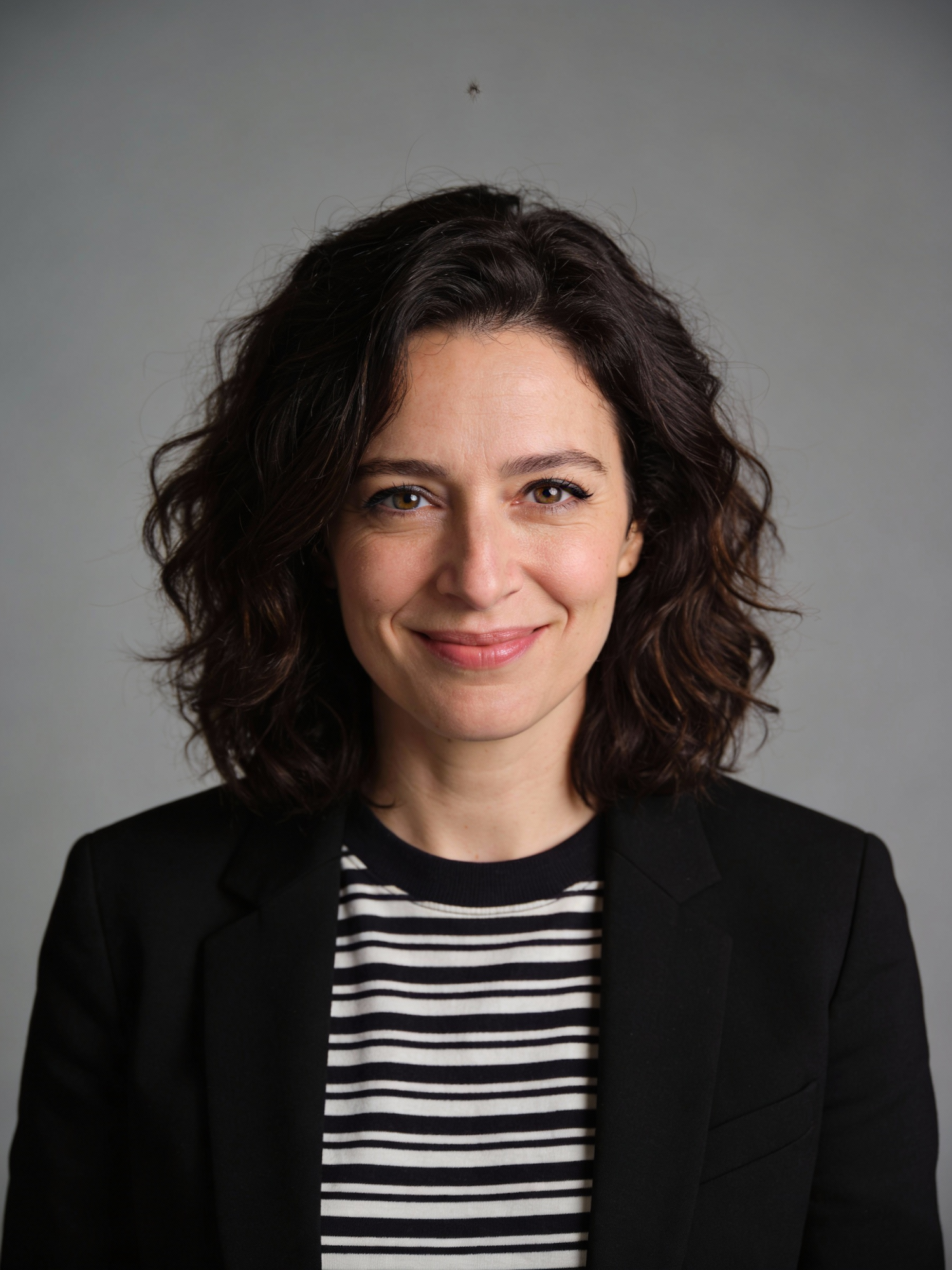 Studio portrait of a French female Creative Director, age 37; fair skin, neutral undertone; shoulder-length dark brown curly hair with natural volume; subtle eyeliner; simple black blazer over a striped black-and-white crewneck top; neutral mid-gray seamless backdrop; Rembrandt lighting with soft fill; 105 mm macro-sharp. Expression: confident and a bit playful, soft asymmetric closed-mouth smile. Framing: portrait orientation, 3:4 ratio; mid-chest-up composition. Subject centered, camera at eye level, front view. Full head and hair completely inside the frame with a little space above; both shoulders visible, no cropping at the top or sides. Neutral studio composition, no props.