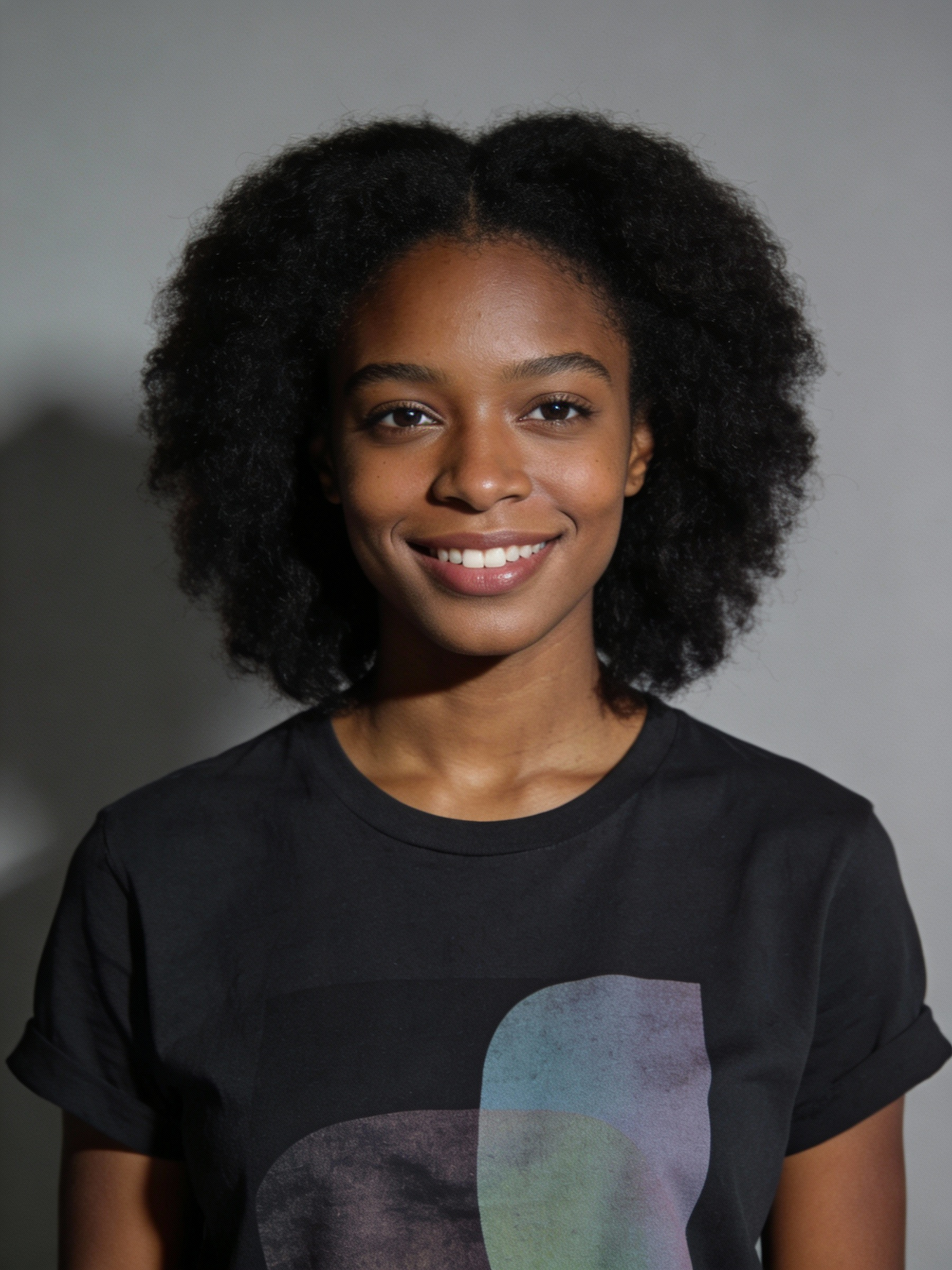 Studio portrait of a Nigerian female in her late 20s; deep brown skin, cool undertone; medium-length rounded afro, soft texture; minimal makeup; dark t-shirt with a simple abstract graphic in muted colors (non-branded), no text; neutral mid-gray seamless backdrop; Rembrandt lighting with soft fill; 105 mm macro-sharp. Expression: creative and relaxed, small smile showing teeth. Framing: portrait orientation, 3:4 ratio; mid-chest-up composition. Subject centered in frame, camera at eye level, facing directly toward the camera (front view). Full head and hair completely inside the frame with a little space above; both shoulders visible, no cropping at the top or sides. Neutral studio composition, no props.