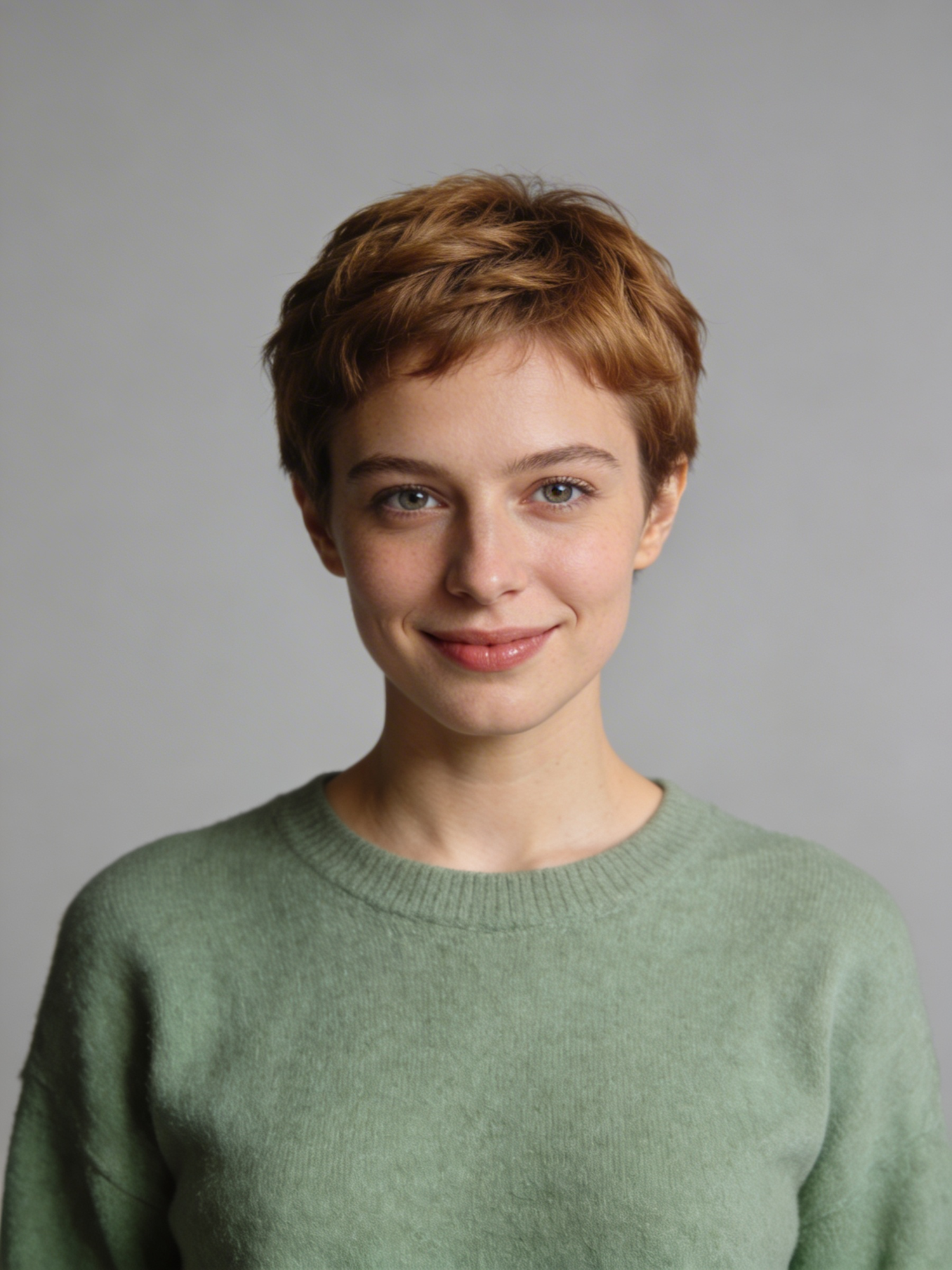 Studio portrait of a woman in her early 30s; light neutral skin tone; short textured pixie haircut in warm brown; no visible jewelry; wearing a plain soft sage-green sweater, no logos; neutral cool-gray seamless backdrop; Rembrandt lighting with soft fill; 105mm macro-sharp, f/7.1, ISO 100, ultra-high detail, crisp micro-contrast, no smoothing or blur. Expression: open and relaxed, subtle smile. Framing: portrait orientation, 3:4 ratio; mid-chest-up, centered at eye level; full head and hair visible.