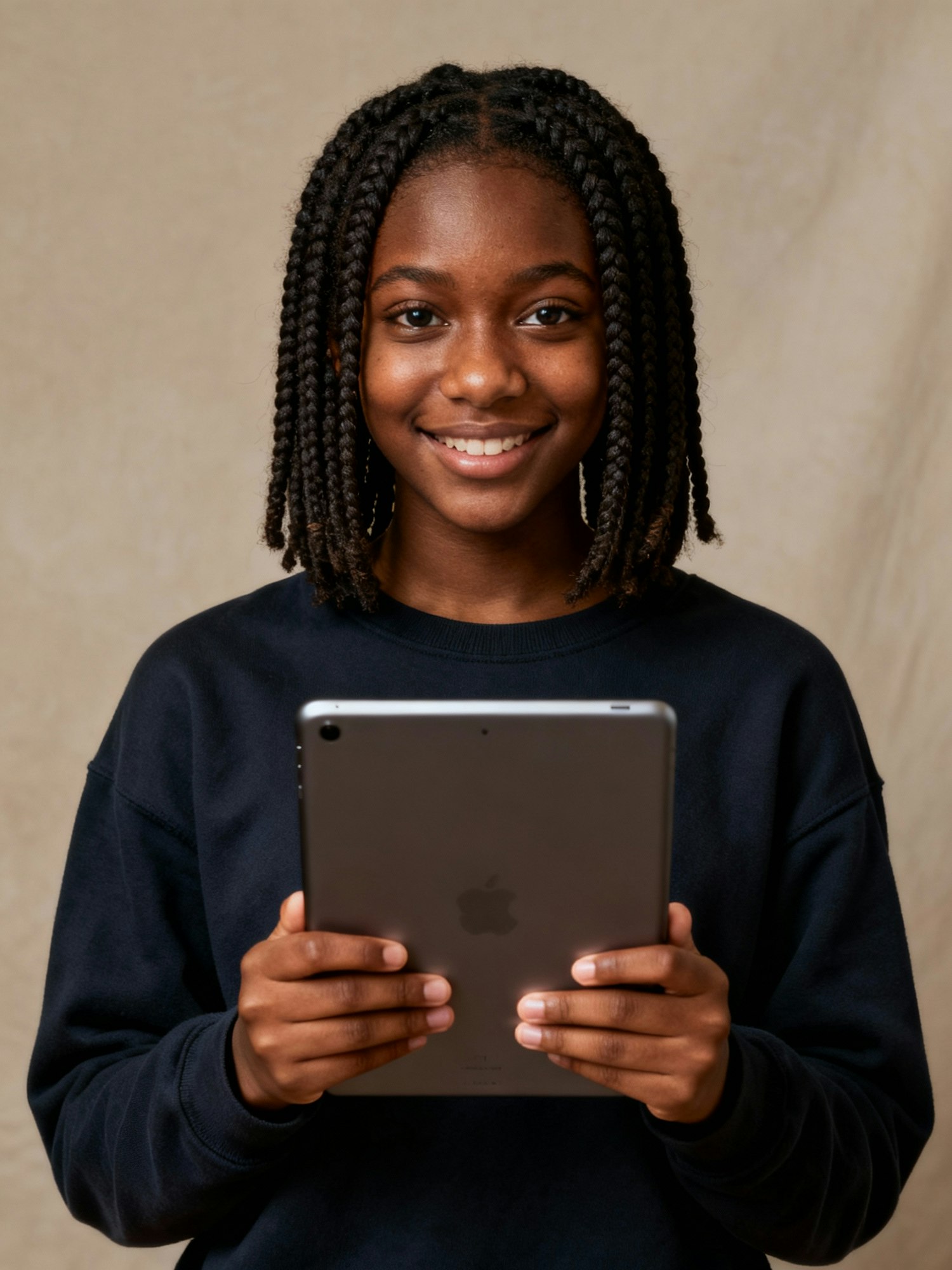 Studio portrait of a Black female high-school student; deep warm skin; shoulder-length box braids; casual crewneck top; neutral seamless backdrop; Rembrandt lighting; 105 mm macro-sharp; photorealistic. She holds a tablet with both hands.