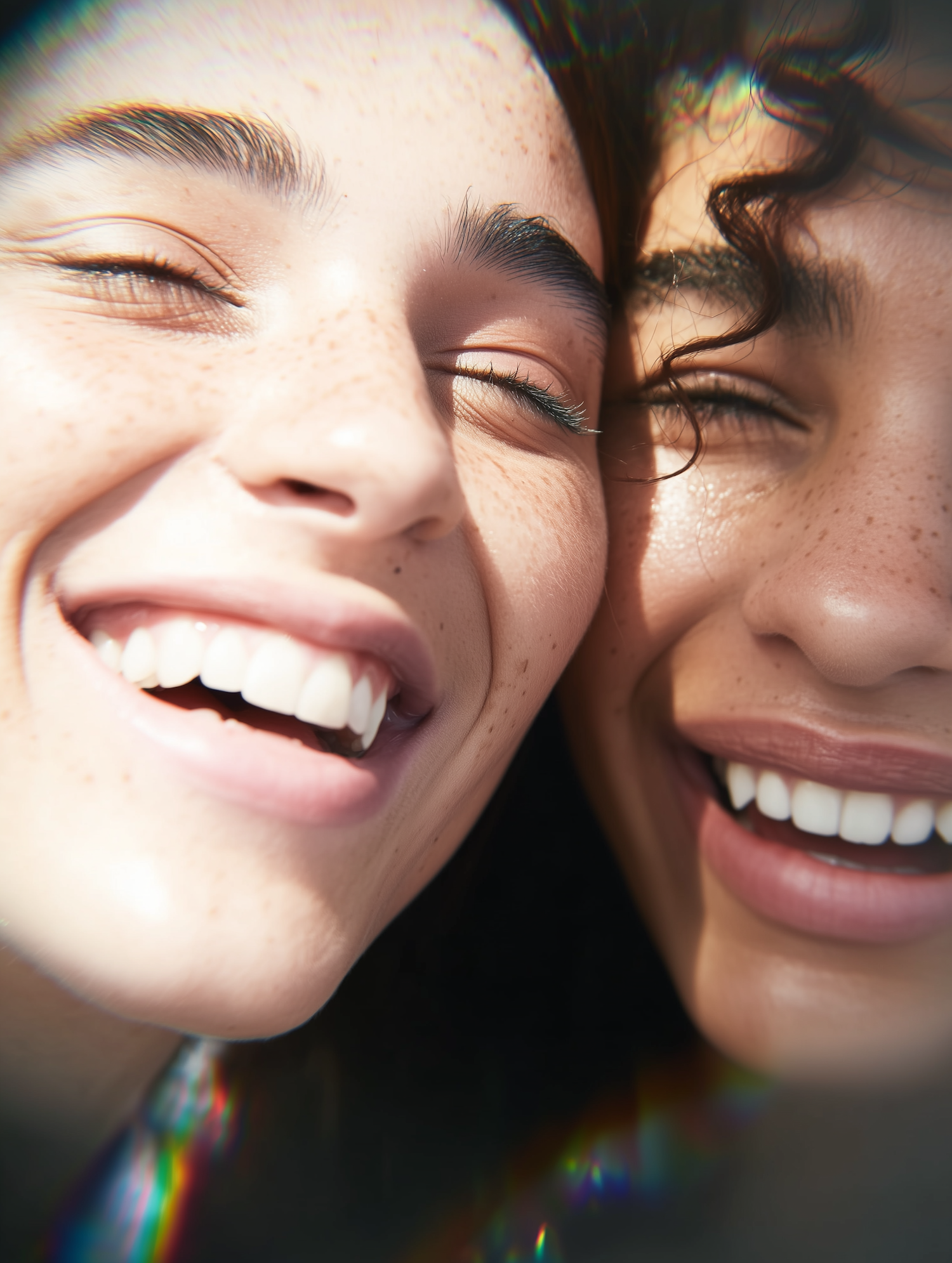 Two cheerful individuals, close to each other, smiling brightly in natural sunlight. Their joy and closeness exude warm and positive vibes.