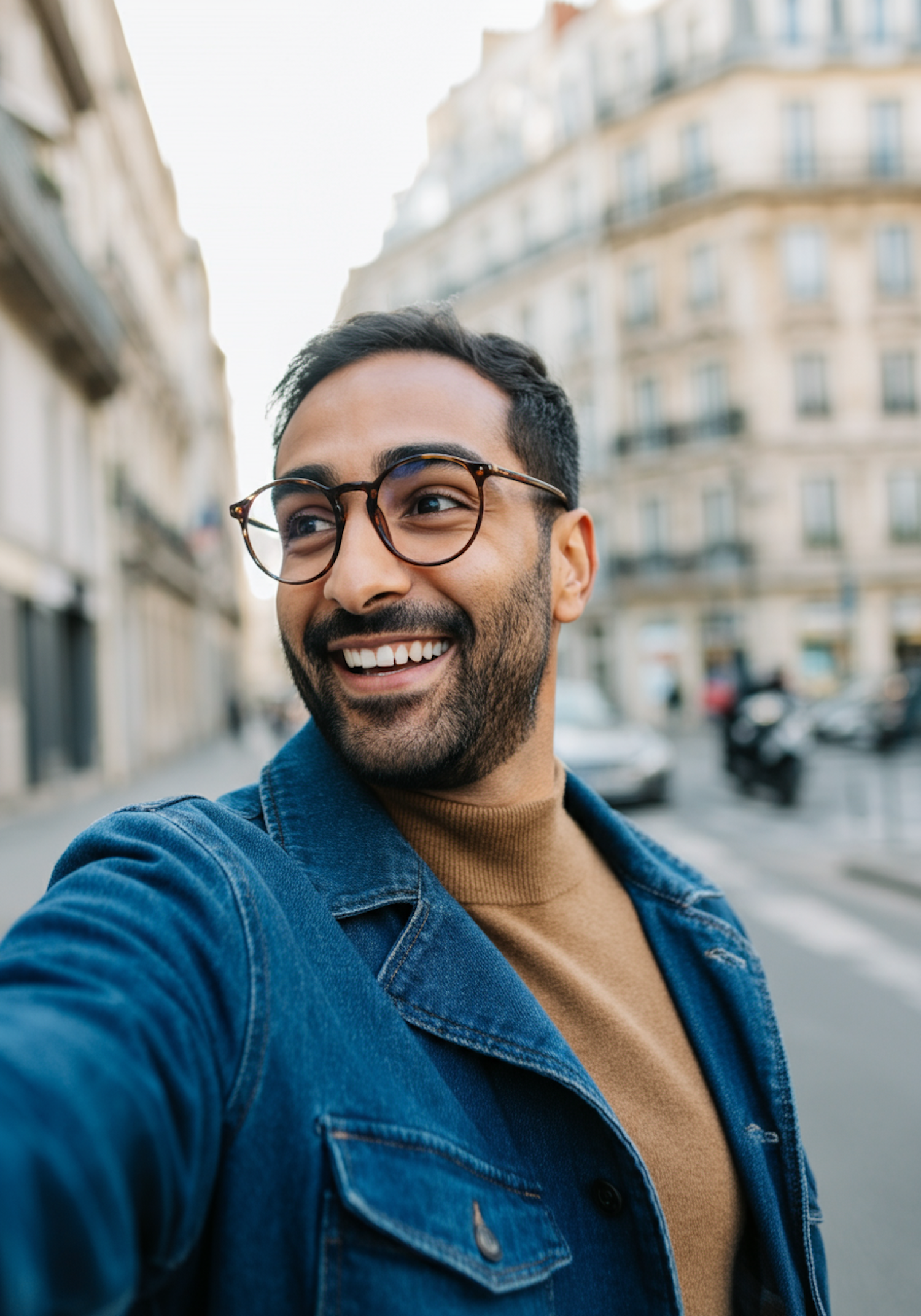 A cheerful man in glasses and a denim jacket smiles in a vibrant city street with classic European architecture in the background.