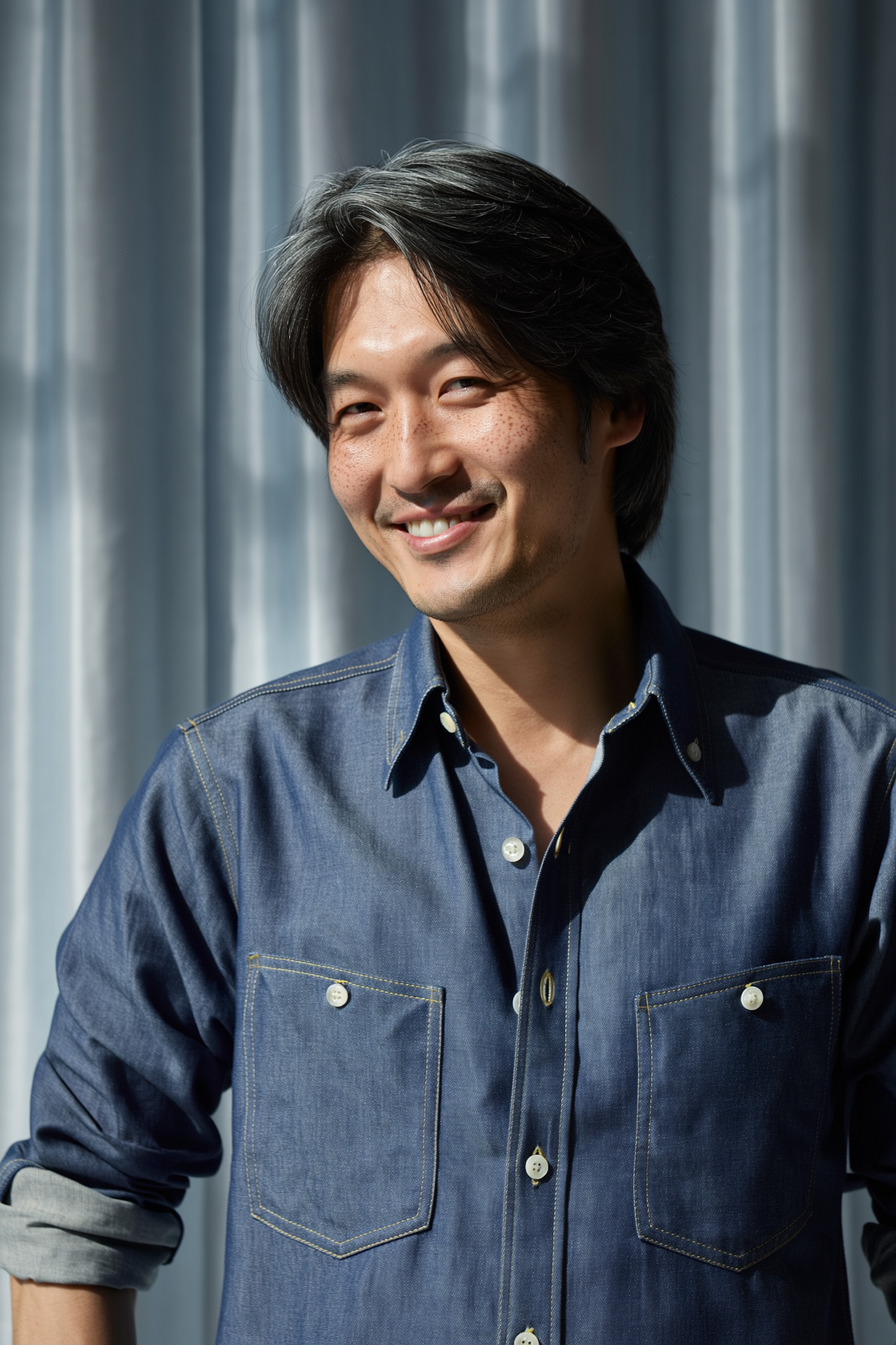 A man in a denim shirt smiles warmly against a softly lit curtain background, creating a casual and inviting atmosphere.