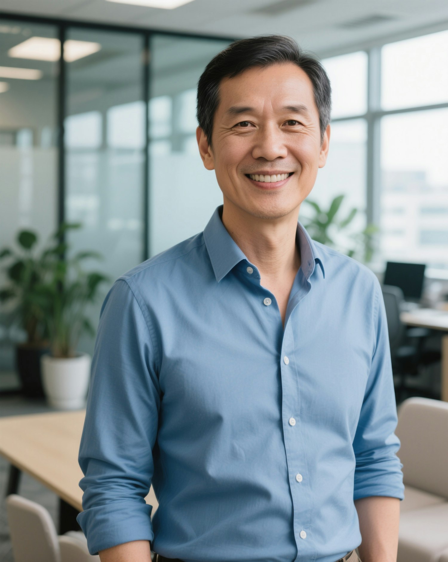 a close up portrait of a middle-man professional vietnamese in casual with office background, look directly to the camera and relaxing