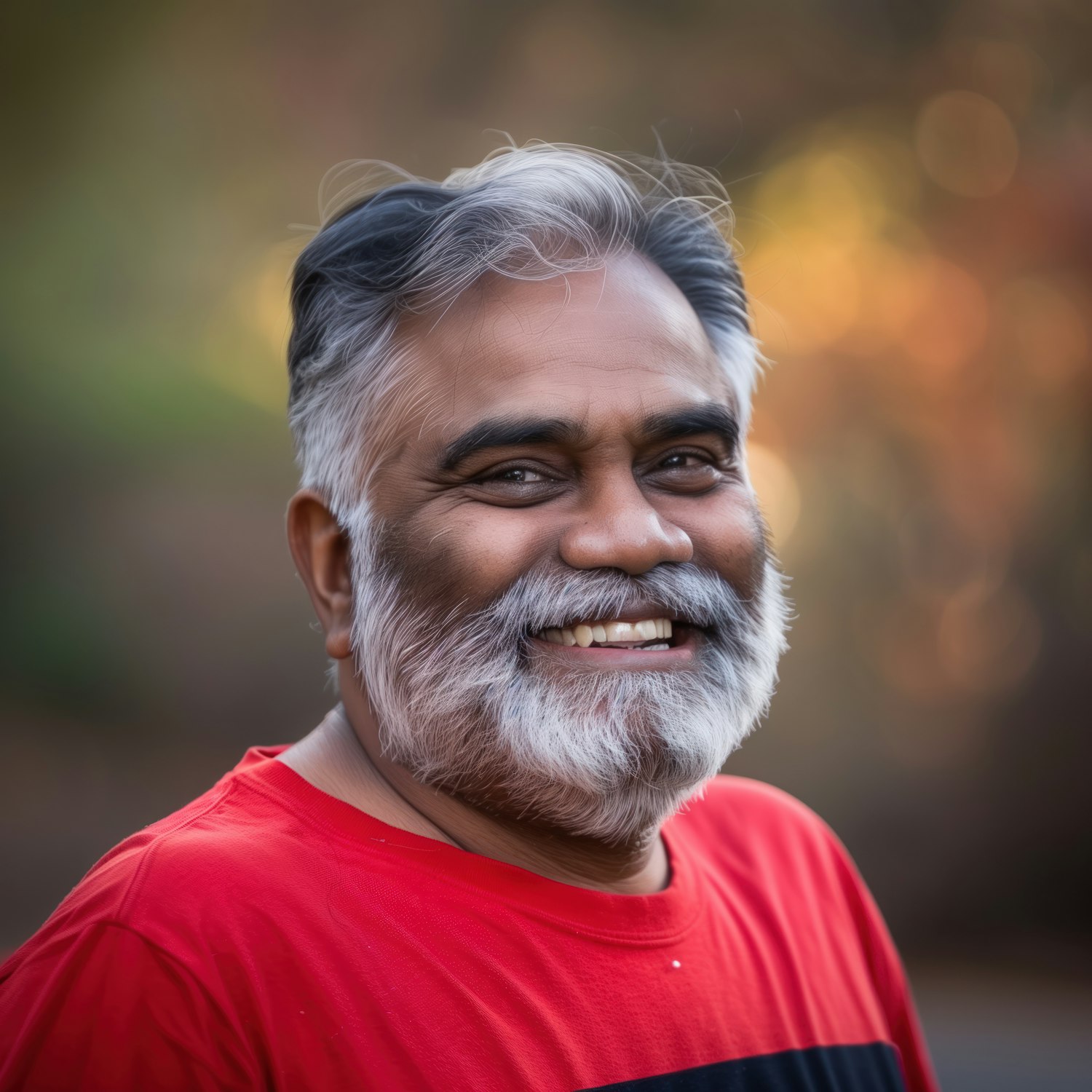 Smiling South Asian man with a white beard in a red shirt, set against a warm, blurred background with bokeh effects.
