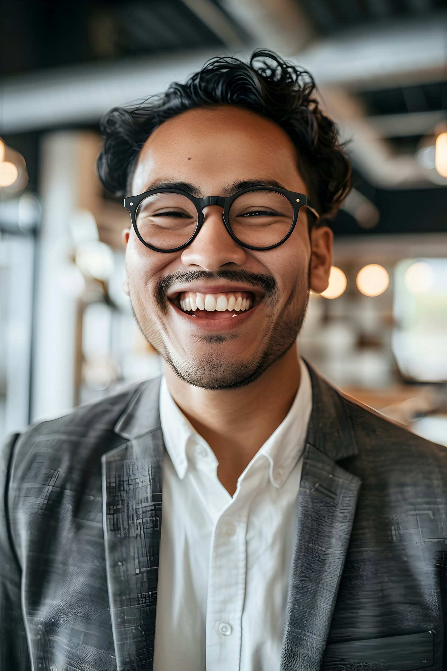 Smiling Asian man in glasses and suit, standing in a modern, warmly lit indoor setting.