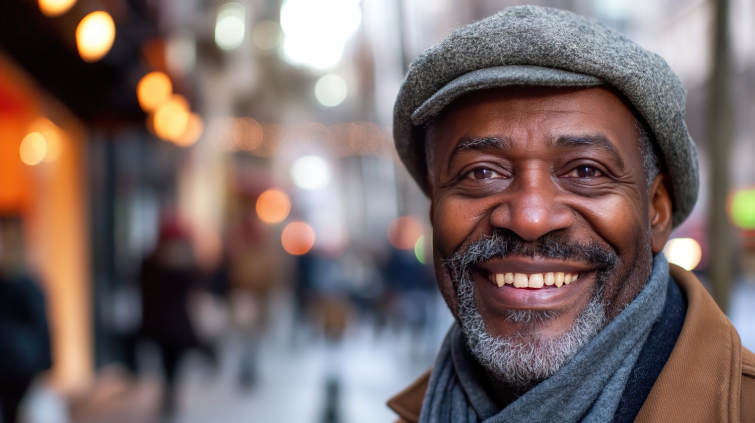Smiling middle-aged Black man in a city, wearing a gray cap and brown coat, with blurred urban lights in the background.