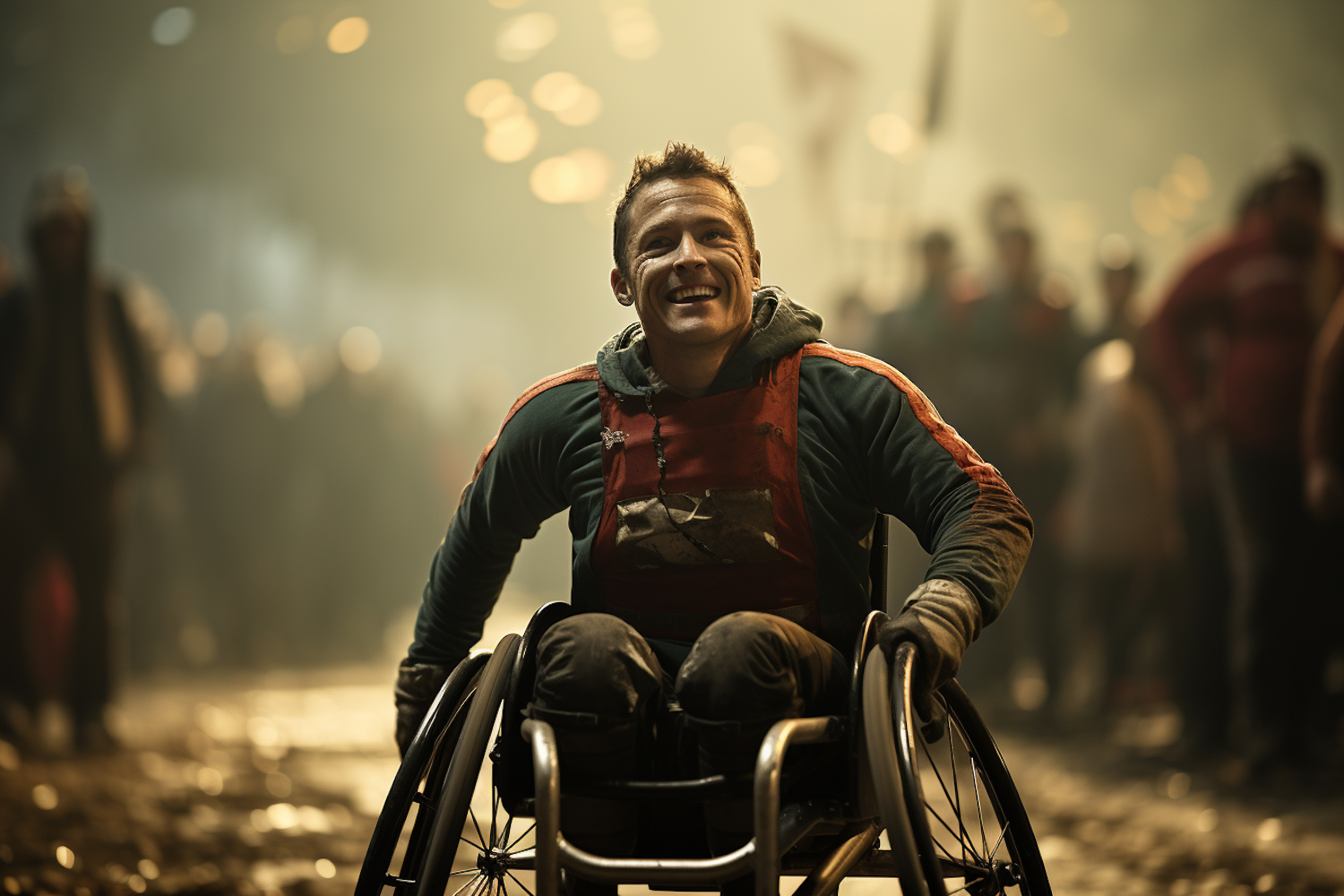A joyful man in a wheelchair amidst a festive crowd, glowing lights, and a sense of celebration and triumph.