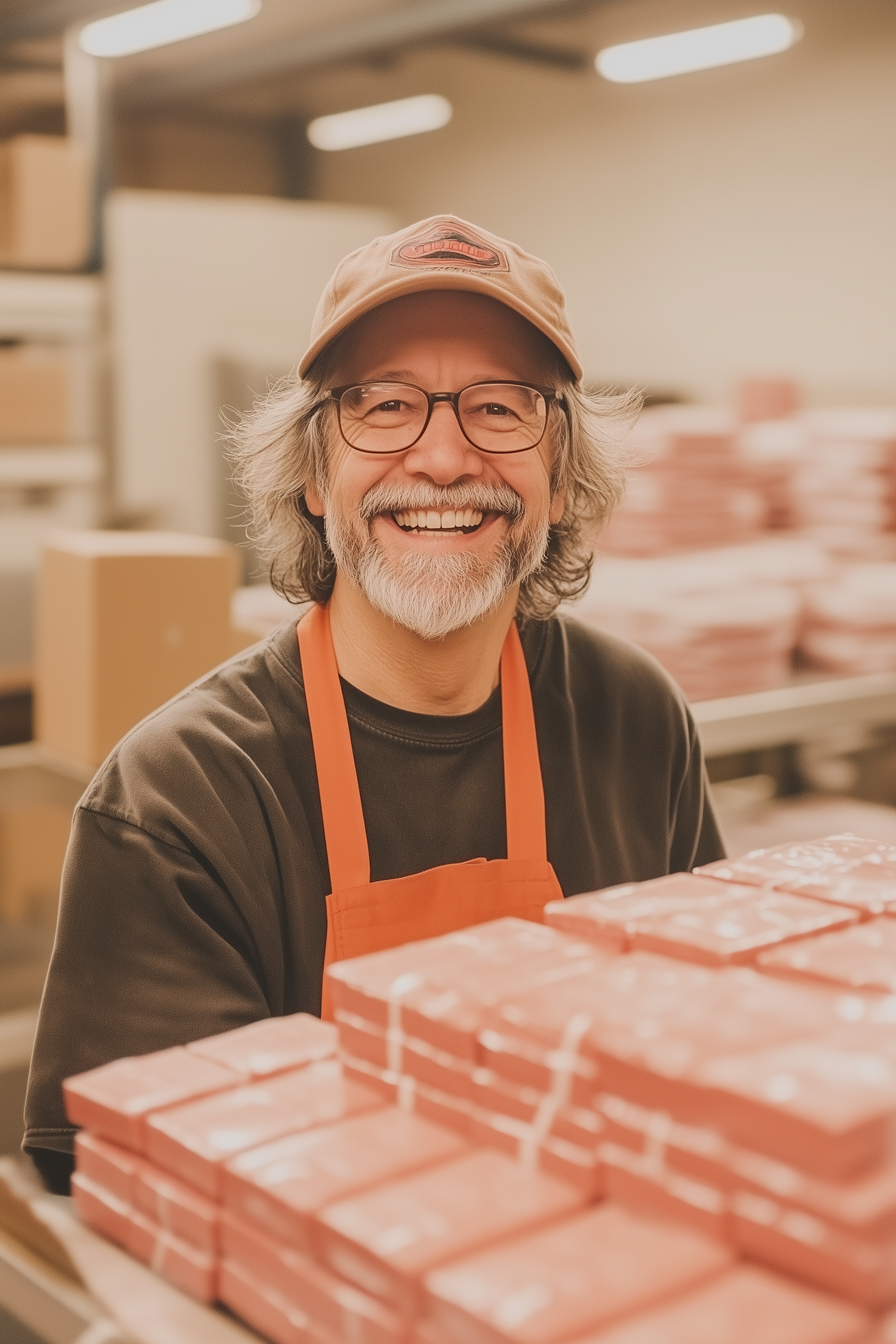 Smiling older man in an orange apron with stacks of red packages in a warehouse setting, exuding warmth and friendliness.