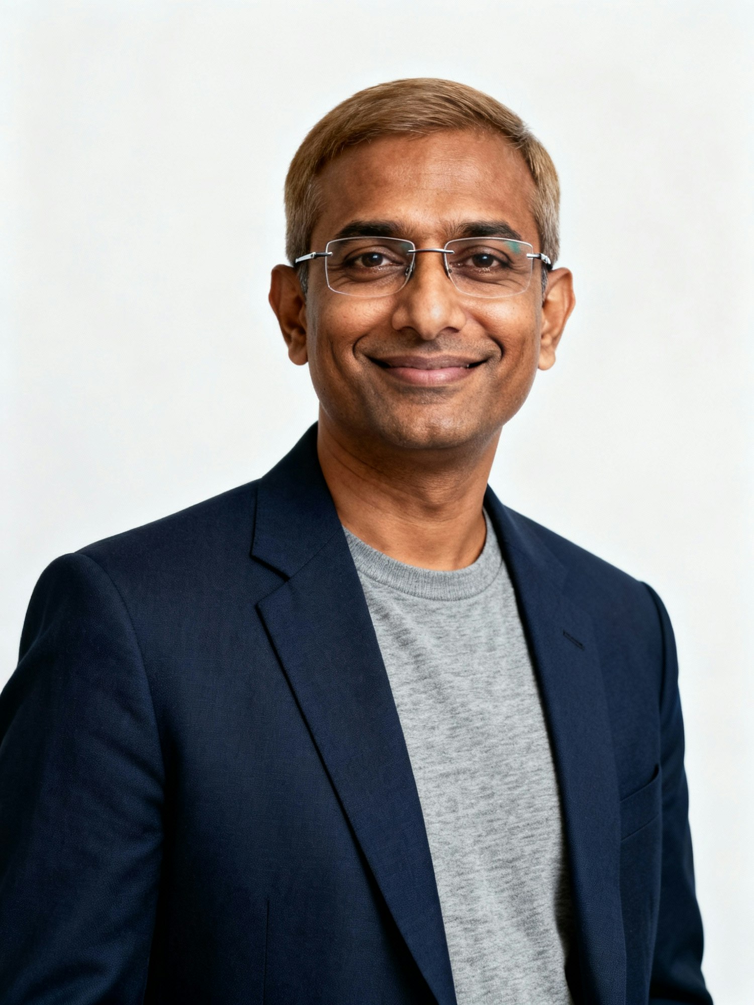 Studio portrait of an Indian man AI product manager, 33; light-brown skin (neutral); short tidy hair; navy blazer over heather-gray crew; frameless glasses. Composition and settings as above (white seamless, high-key, soft Rembrandt, 105 mm). Expression: confident, calm half-smile. Negative: techy neon gels, over-retouch, visible wrinkles erased.