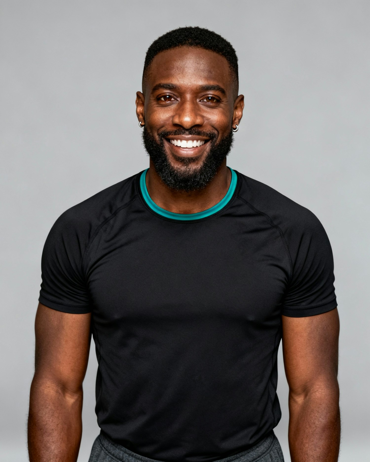 Studio portrait of a Nigerian man personal trainer, age 34; deep brown skin, warm-neutral; close-cropped natural hair, neatly trimmed beard; dark brown eyes; black performance tee, micro-emerald neck binding (non-branded). Neutral mid-gray seamless; clamshell soft key + gentle rim; crisp white light; 105 mm macro-sharp. Expression: open, confident smile. Skin: rich tone, lightly smoothed. Negative as above.Neutral mid-gray seamless backdrop; clamshell soft key + gentle rim; crisp white studio light; 105 mm macro-sharp detail. Framing: head-and-shoulders, eyes to camera. Skin: natural glow, lightly smoothed, no harsh retouch. Expression: warm, confident smile. Wardrobe system: non-branded black performance tops with subtle emerald accents (piping/zip/trim), charcoal bottoms; tidy grooming; simple small jewelry only. Negative: over-retouch, brand logos, watermarks, sweat stains, props, banding.
