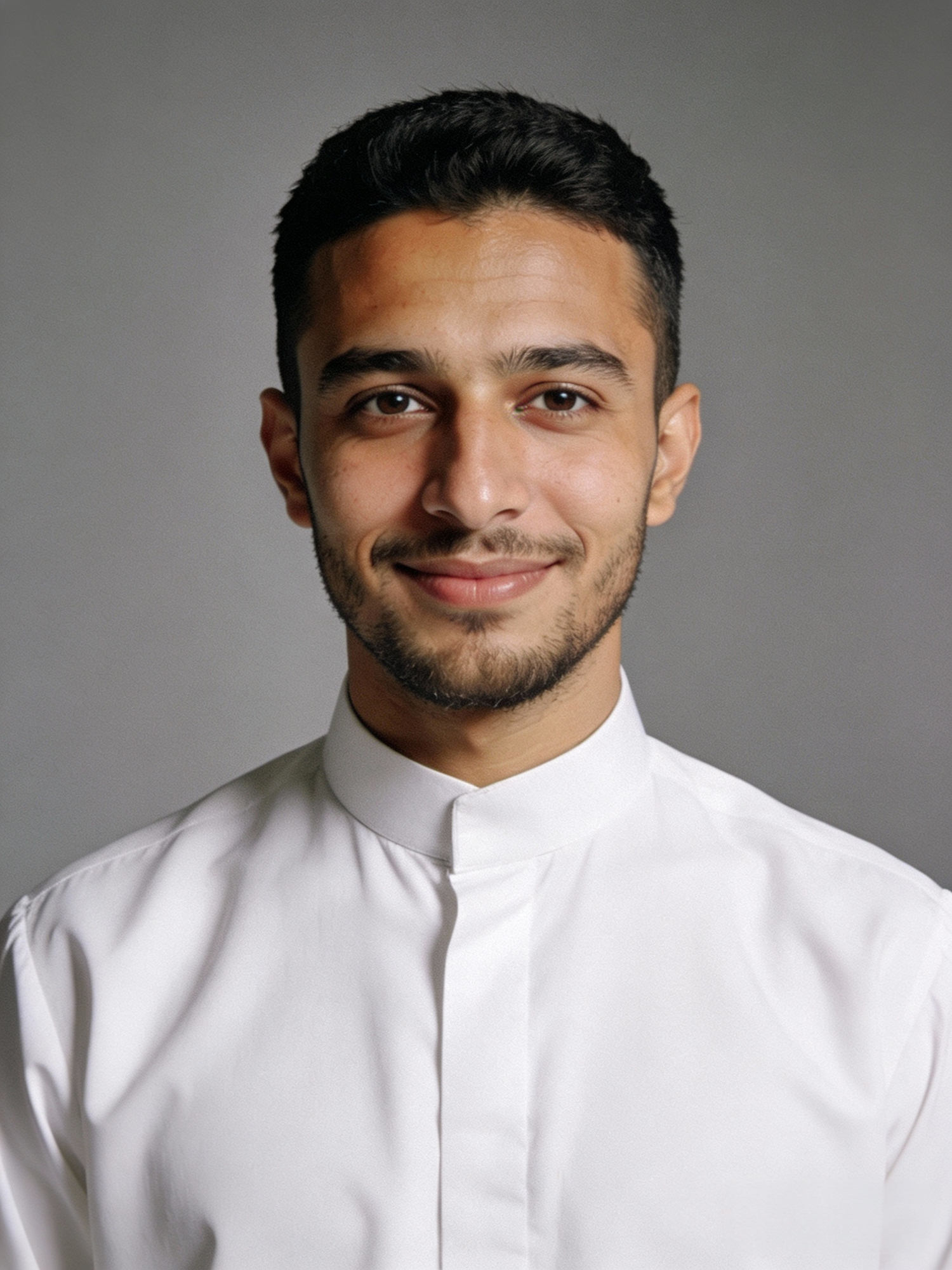 A man with short black hair and a trimmed beard smiles gently, wearing a white collared shirt against a neutral gray background.