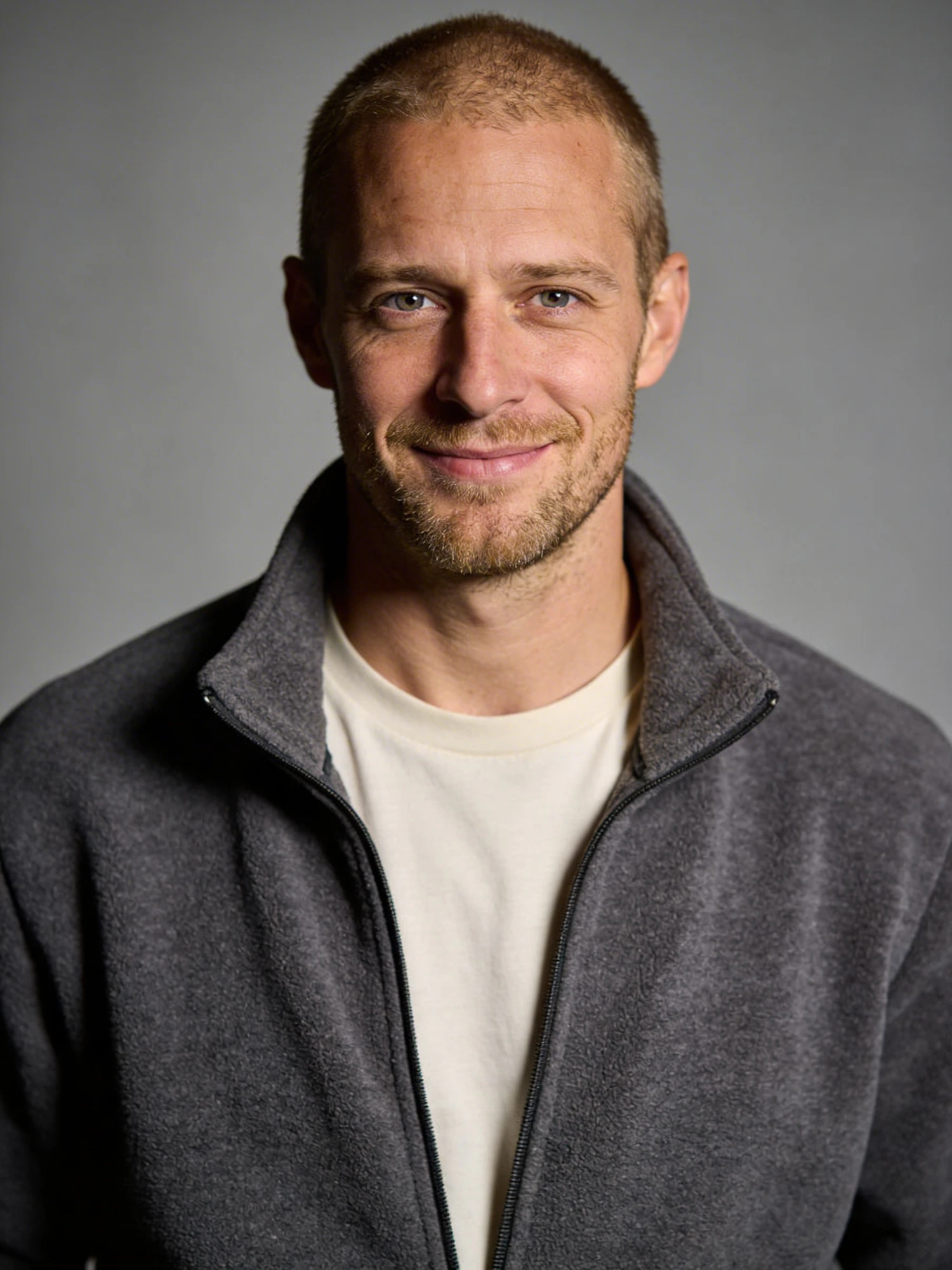 A man with short hair and a trimmed beard smiles gently, wearing a gray fleece jacket and light shirt against a neutral background.