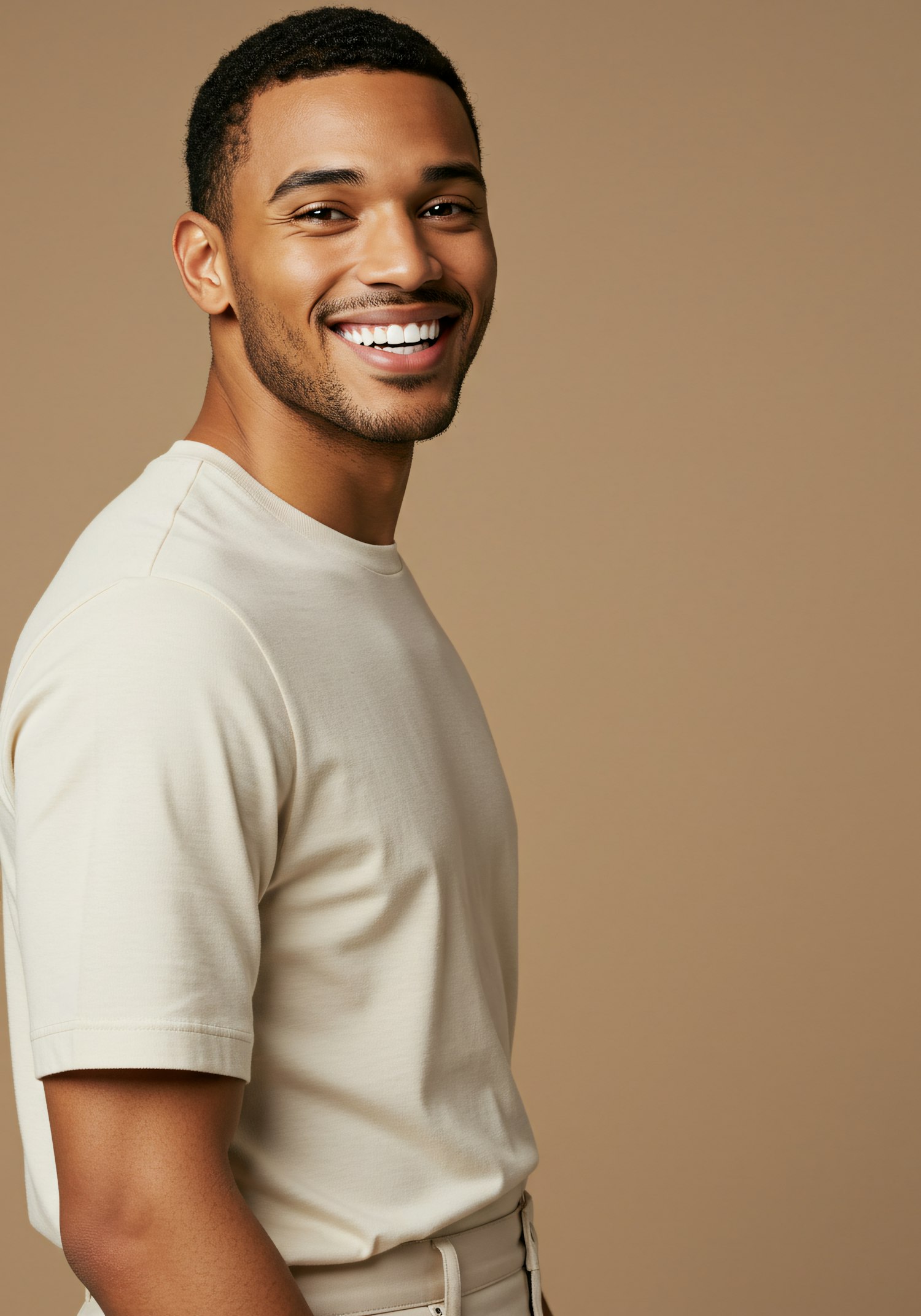 A cheerful man in a beige shirt smiles warmly against a neutral background, exuding a friendly and approachable vibe.