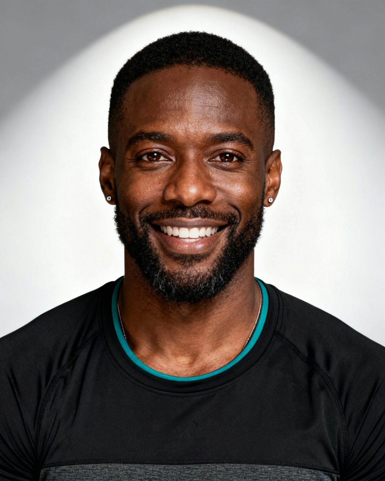 Studio portrait of a Nigerian man personal trainer, age 34; deep brown skin, warm-neutral; close-cropped natural hair, neatly trimmed beard; dark brown eyes; black performance tee, micro-emerald neck binding (non-branded). Neutral mid-gray seamless; clamshell soft key + gentle rim; crisp white light; 105 mm macro-sharp. Expression: open, confident smile. Skin: rich tone, lightly smoothed. Negative as above.Neutral mid-gray seamless backdrop; clamshell soft key + gentle rim; crisp white studio light; 105 mm macro-sharp detail. Framing: head-and-shoulders, eyes to camera. Skin: natural glow, lightly smoothed, no harsh retouch. Expression: warm, confident smile. Wardrobe system: non-branded black performance tops with subtle emerald accents (piping/zip/trim), charcoal bottoms; tidy grooming; simple small jewelry only. Negative: over-retouch, brand logos, watermarks, sweat stains, props, banding.