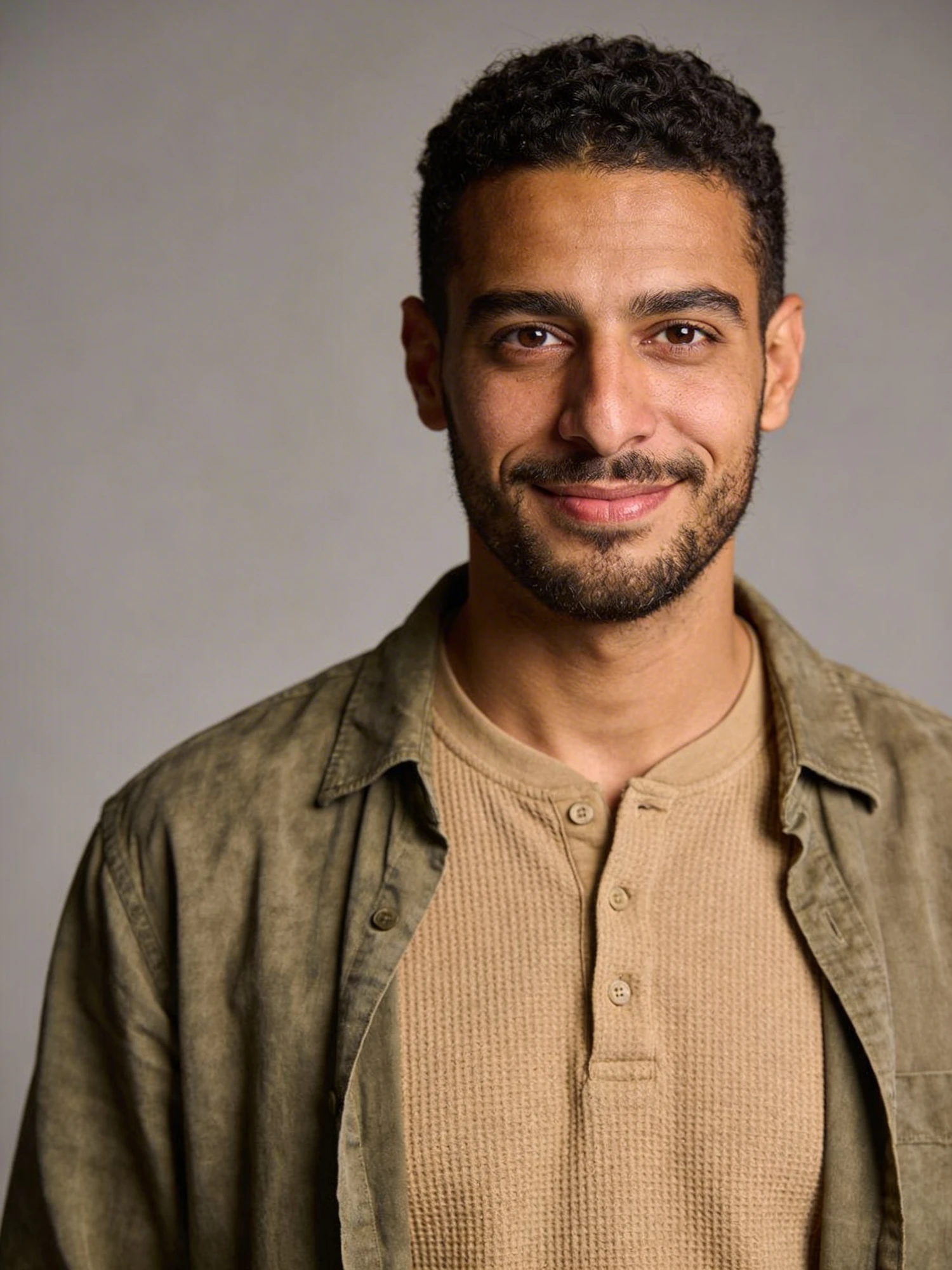 A man with short curly hair and a trimmed beard smiles warmly, wearing a beige henley and olive shirt against a neutral background.