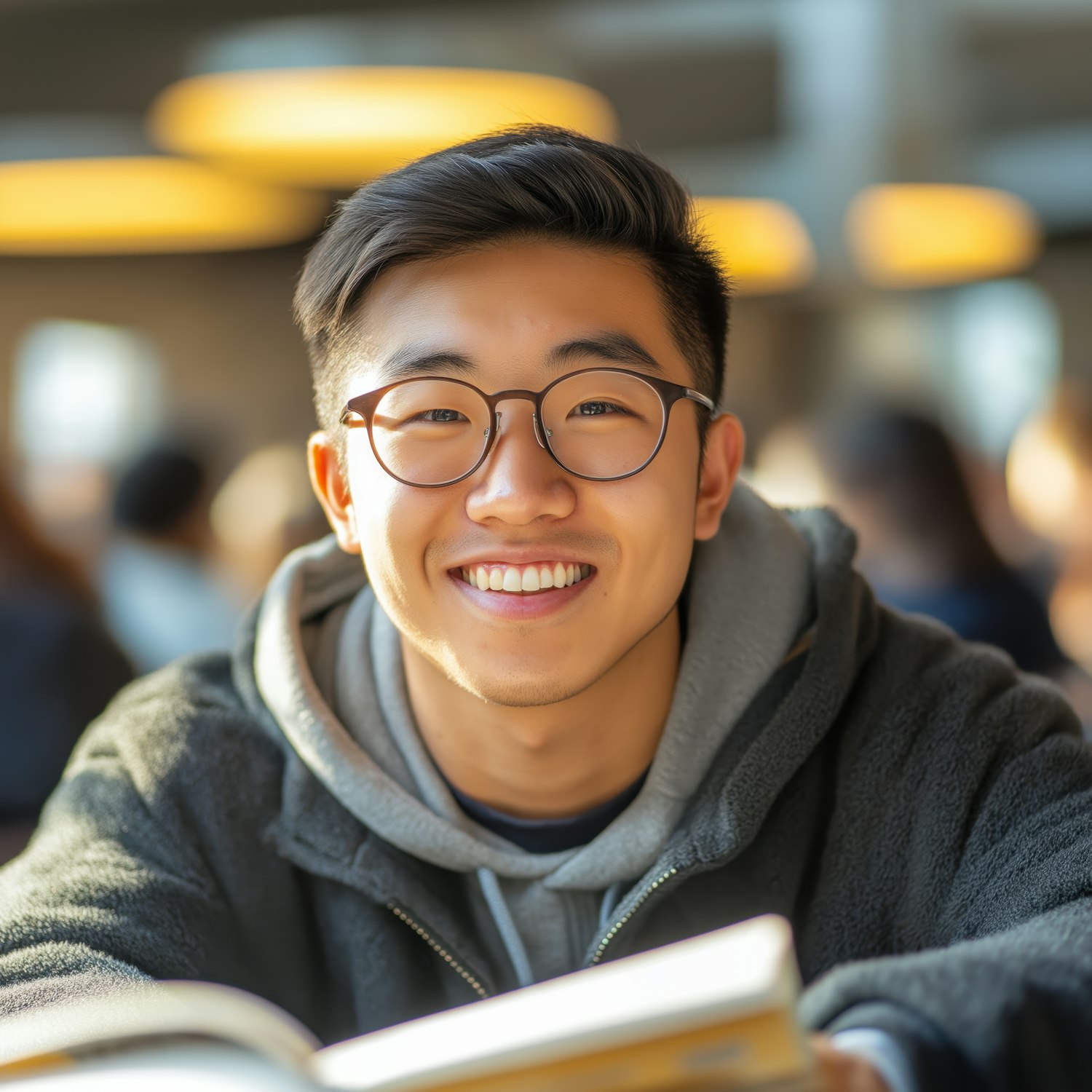 Smiling young man with glasses reading in a cozy, well-lit space. Warm lighting and blurred background create a relaxed atmosphere.