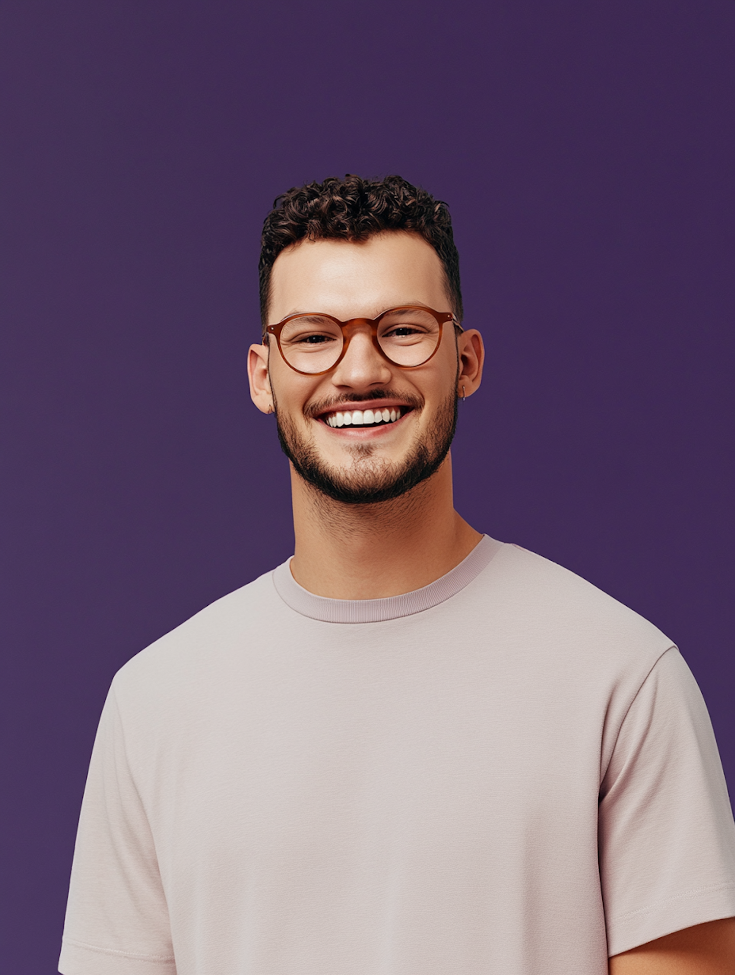 Smiling young man with curly hair and glasses against a purple background, wearing a beige t-shirt. Modern and vibrant portrait.