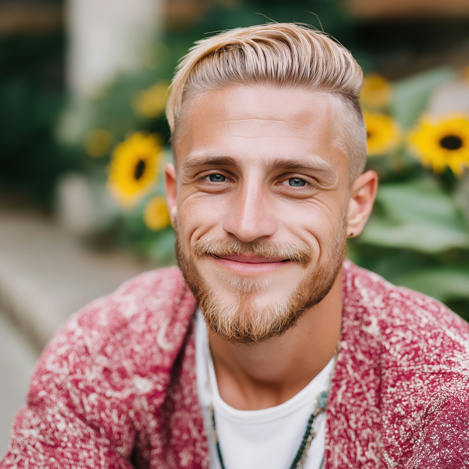 Smiling blonde man with a beard in a red cardigan, sitting outdoors with sunflowers in the background.
