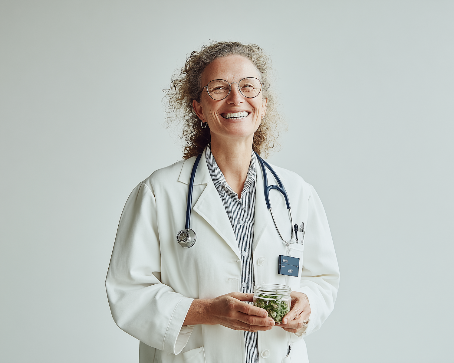 A smiling professional in a lab coat holding a jar of green herbs, showcasing a blend of science and natural remedies.