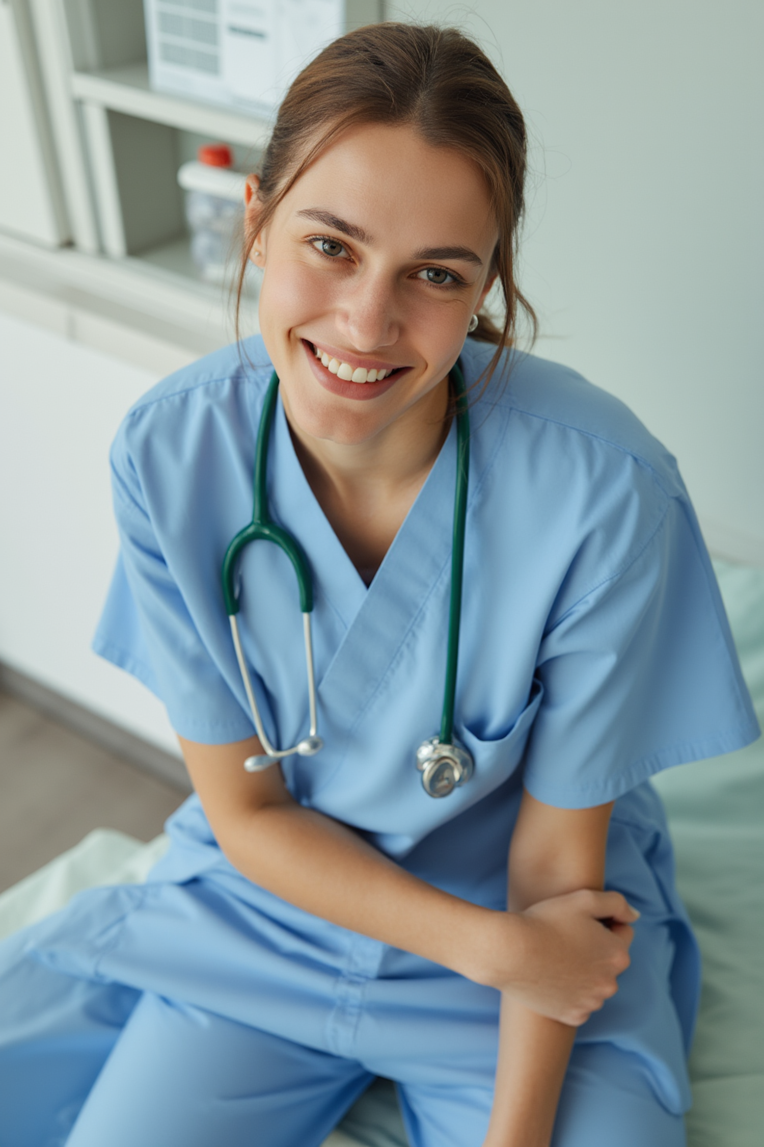 A friendly healthcare professional in blue scrubs and a stethoscope, smiling warmly in a clinical setting.