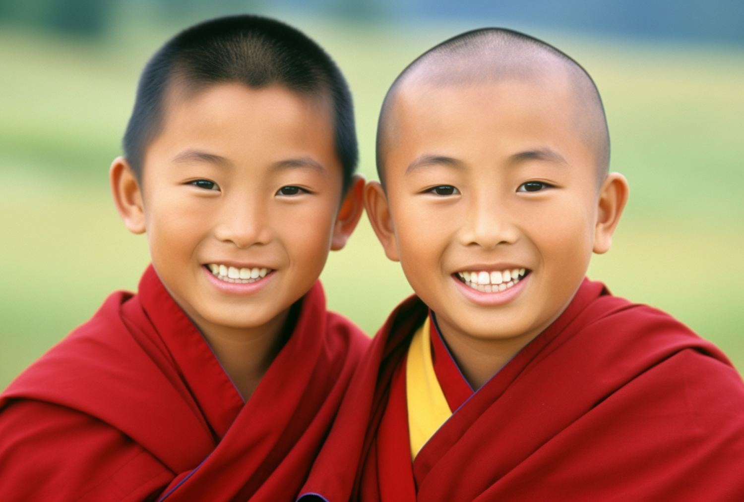 Two smiling young boys in red robes, exuding joy and innocence against a soft green background, suggesting a serene outdoor setting.