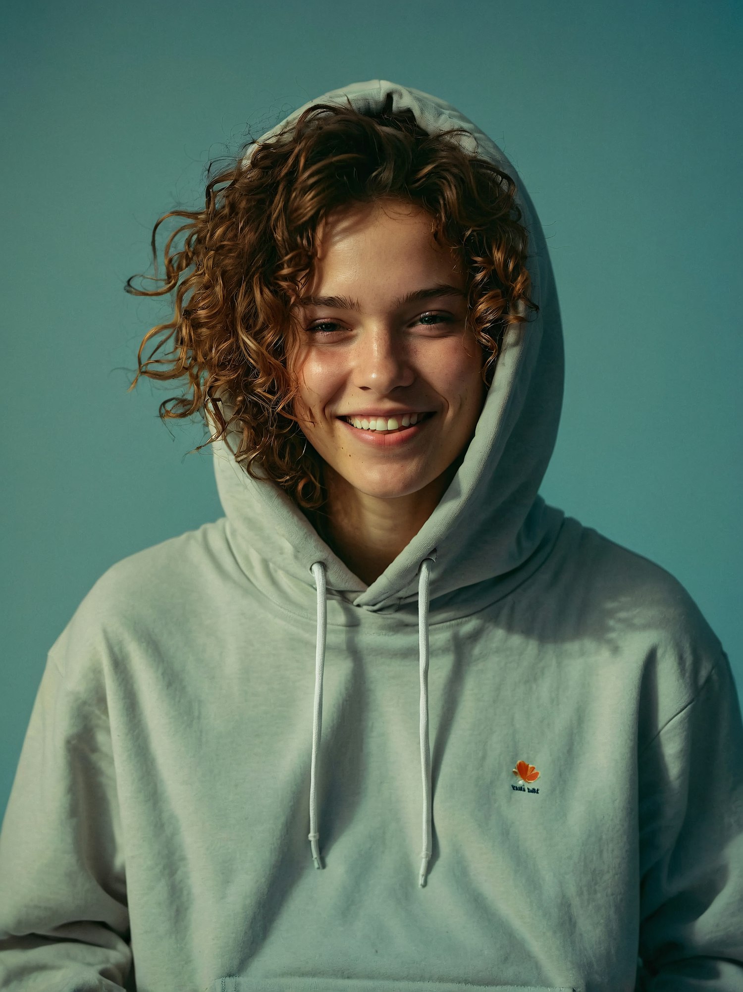 Curly auburn-haired person in a gray hoodie with 'Don't ask' flower design, set against a muted teal background.