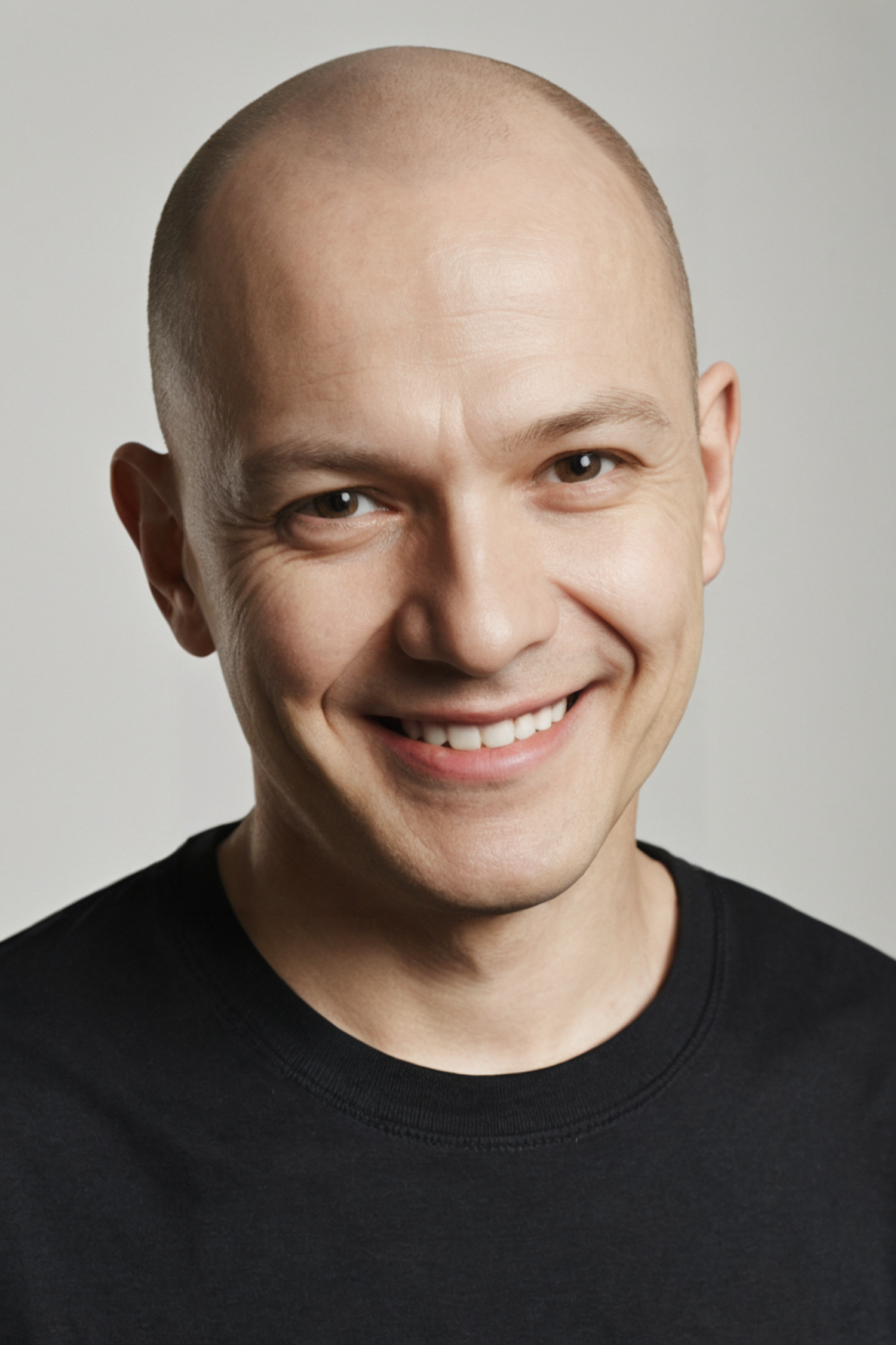 Headshot of a smiling individual in a black t-shirt against a light gray background, showcasing a friendly and approachable expression.