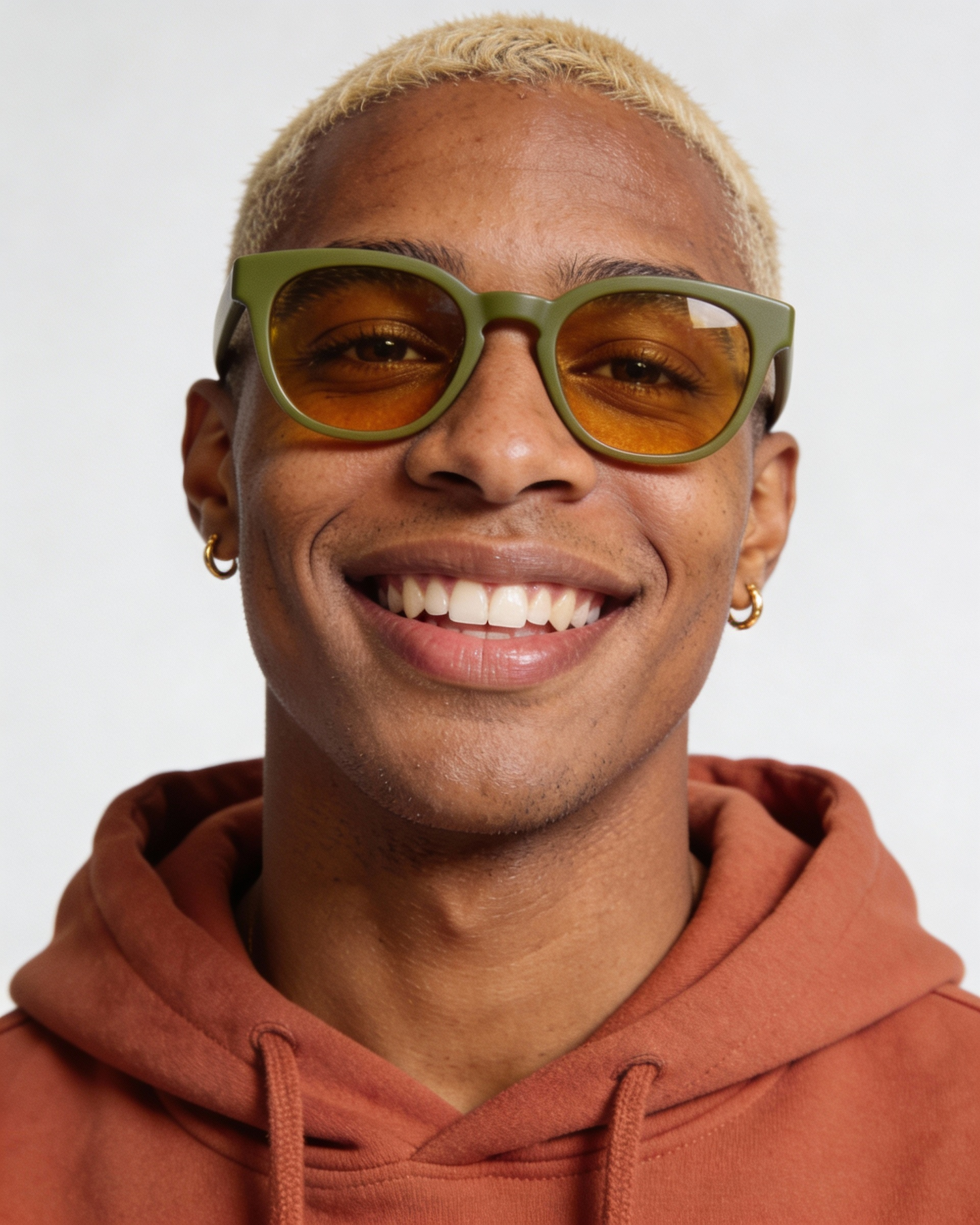 A smiling individual with blonde hair, green glasses, and a rust hoodie, showcasing a cheerful and stylish look.