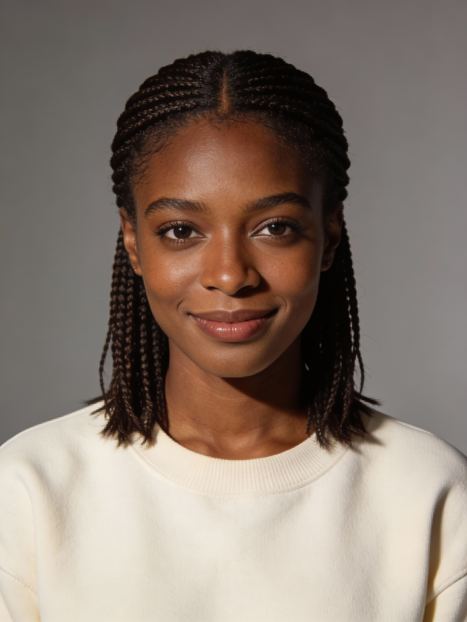 Studio portrait of a Fulani female in her late 20s; deep brown skin, warm undertone; fine micro braids with a clean center part, braids falling to shoulders; minimal makeup. Outfit: cream crewneck sweater, no logos. Neutral mid-gray seamless backdrop; Rembrandt lighting with soft fill; 105 mm macro-sharp. Expression: calm and confident, soft smile. Framing: 3:4 portrait; mid-chest-up, centered at eye level, facing camera; full head and hair in frame; both shoulders visible.