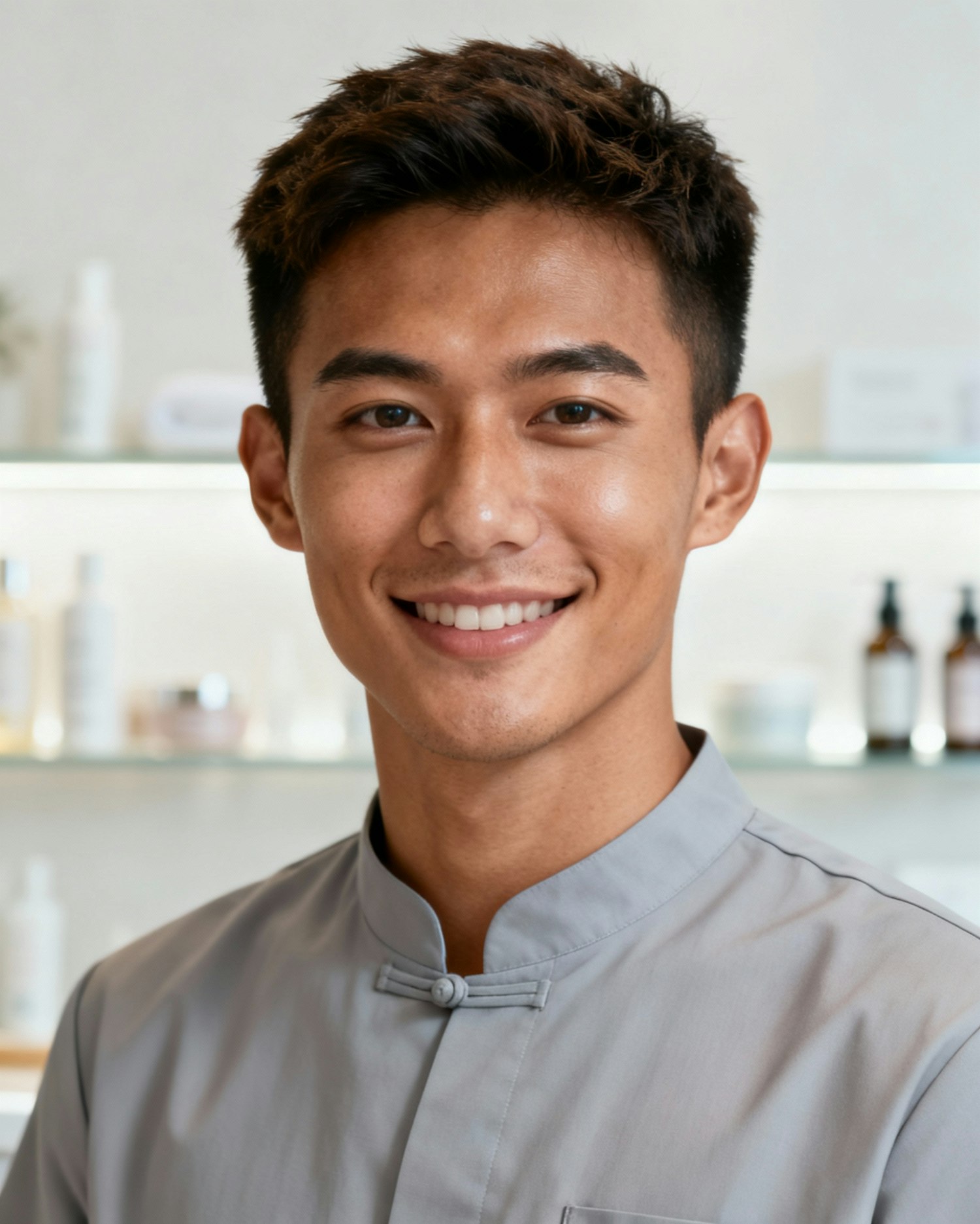 Studio headshot of a male spa receptionist, around 27; tan skin (neutral-warm). Same shared setup. Expression: friendly, relaxed smile; short textured haircut.Defocused spa background (light neutral tones, soft bokeh, shelves with skincare bottles blurred) · soft daylight (~6100 K) · clamshell soft key + gentle rim · 105 mm macro-sharp detail · clean white-neutral color balance (no warmth) · framing: tight head-and-shoulders, eyes to camera · expression: calm, warm, welcoming smile · wardrobe: non-branded light-gray spa uniform/tunic with short sleeves, mandarin collar, neat modern cut · all subjects neatly groomed (hair tied back, simple professional styles for women; tidy short or side-part for men) · skin: natural glow, lightly smoothed, no shine · Negative: over-retouch, heavy makeup, jewelry, logos, watermarks, props, sweat, banding, inconsistent lighting.