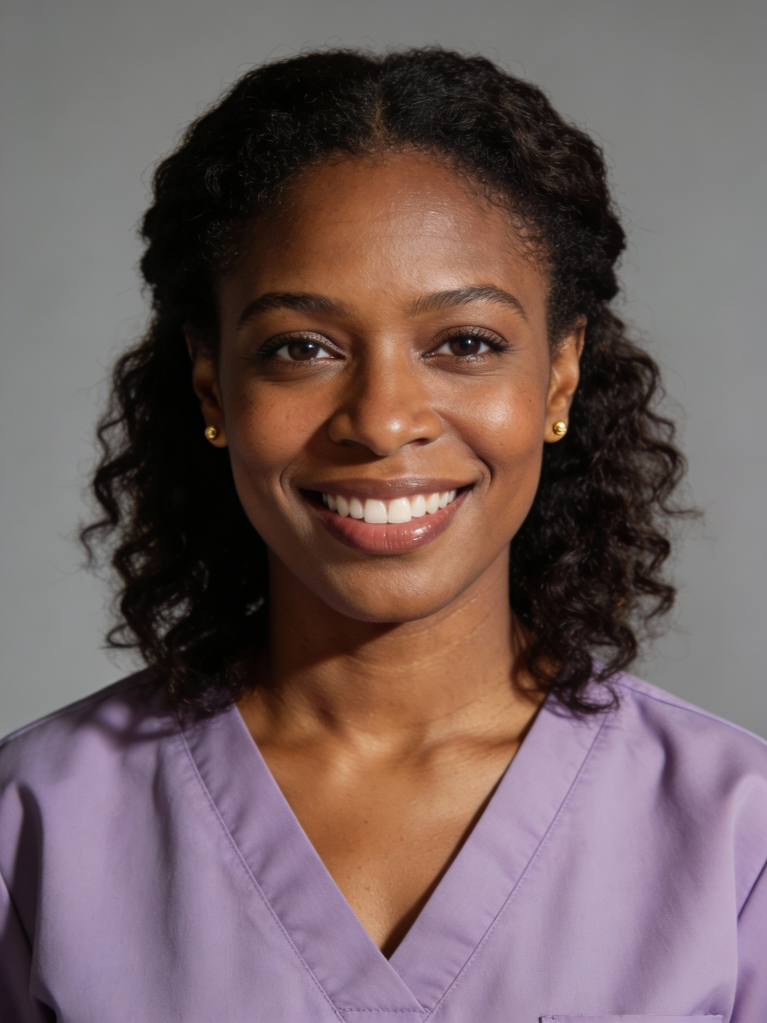 Studio portrait of a Ghanaian female midwife, age 38; deep brown skin, warm undertone; medium-length natural coils, softly shaped; soft lilac scrub top with a V-neck, no logos; simple gold stud earrings; neutral mid-gray seamless backdrop; Rembrandt lighting with soft fill; 105 mm macro-sharp. Expression: calm, reassuring, warm smile showing teeth. Framing: portrait orientation, 3:4 ratio; mid-chest-up composition. Subject centered in frame, camera at eye level, facing directly toward the camera (front view). Full head and hair completely inside the frame with a little space above; both shoulders visible, no cropping at the top or sides. Neutral studio composition, no props.