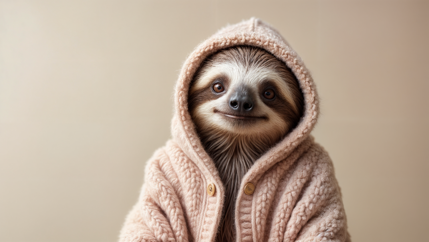Adorable sloth in a cozy beige knitted sweater with a hood, showcasing its gentle smile and expressive eyes against a neutral background.