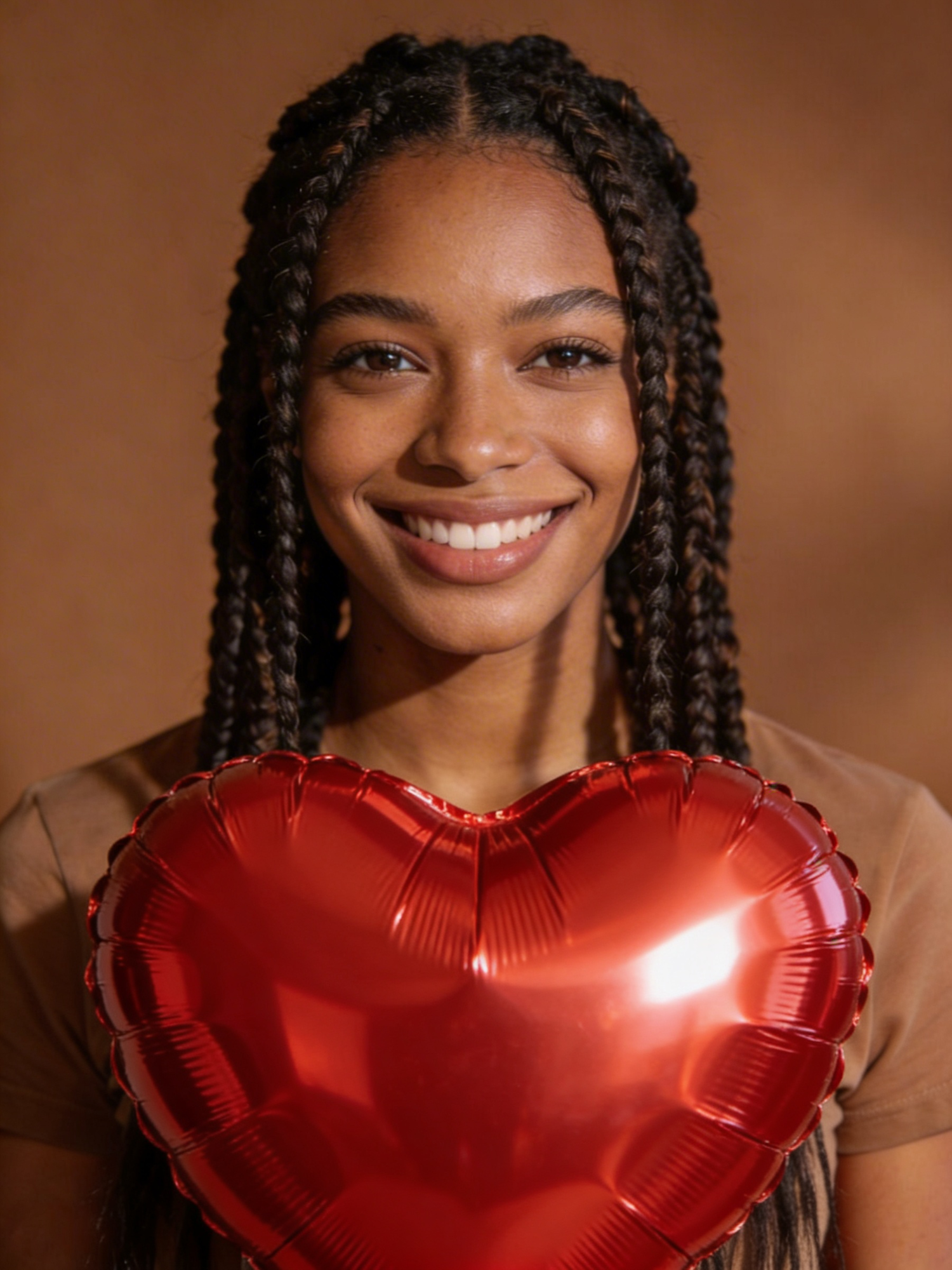A smiling individual with braided hair holds a shiny red heart-shaped balloon against a warm-toned background.