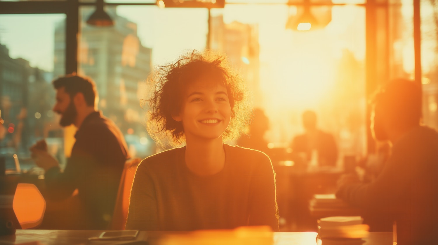 A smiling woman in a sunlit café, surrounded by a warm, golden glow and blurred background patrons, creating a cozy and joyful vibe.