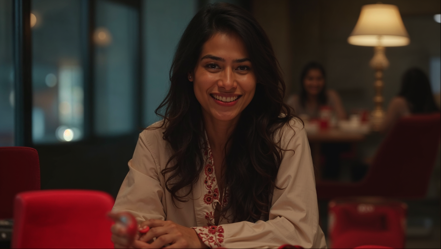 Smiling woman with dark hair in a cozy setting, wearing a beige top with red embroidery. Warm lighting and red chairs enhance the ambiance.