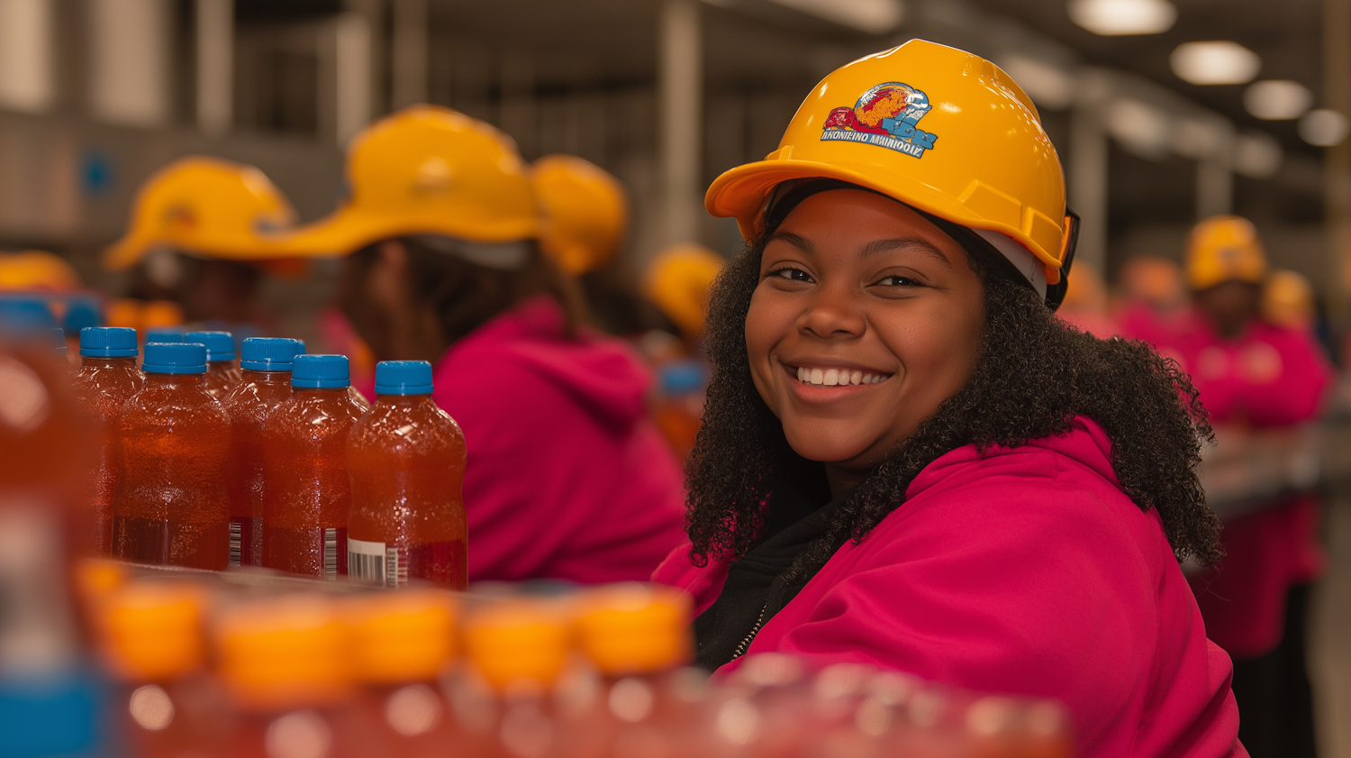 Smiling worker in a pink jacket and yellow hard hat in a factory with orange bottles on a production line.