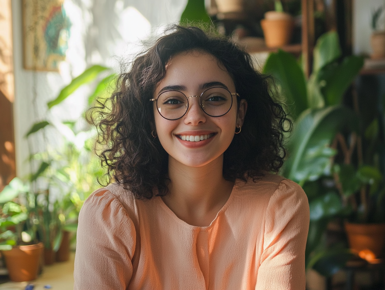 Smiling woman with curly hair and glasses in a cozy indoor garden setting, surrounded by lush green plants and natural light.