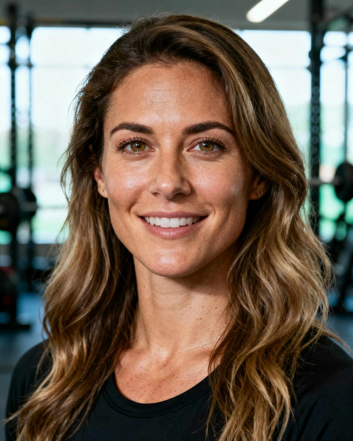 A smiling woman with wavy light brown hair in a gym setting, wearing a black top, with bright natural lighting in the background.