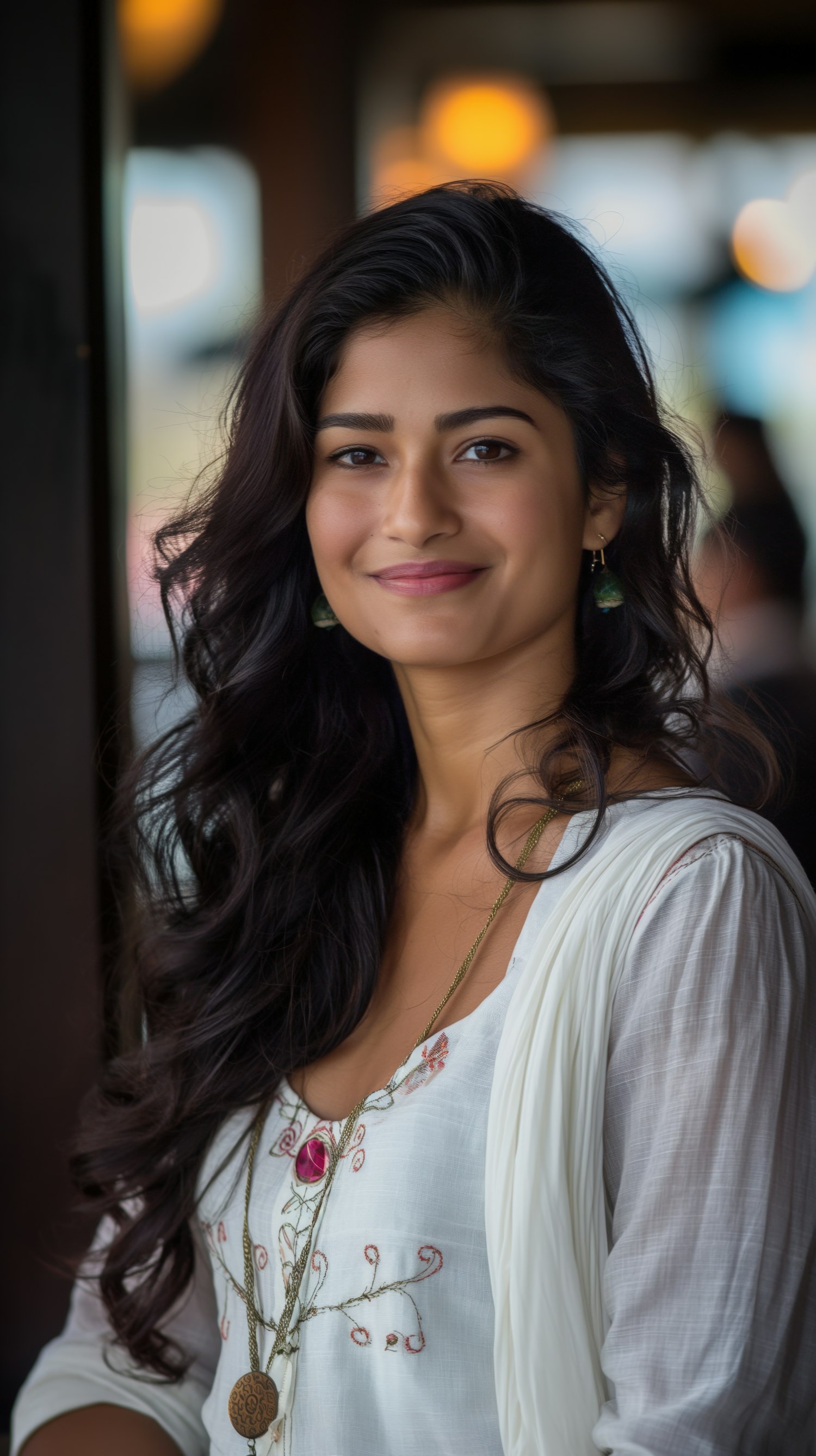 Smiling woman in a white embroidered kurta with wavy black hair, accessorized with green earrings and layered necklaces.