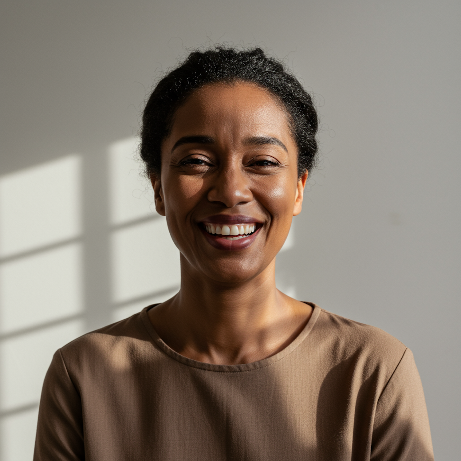 Smiling woman in natural light, wearing a light brown top, with a neutral background and window shadows adding depth.