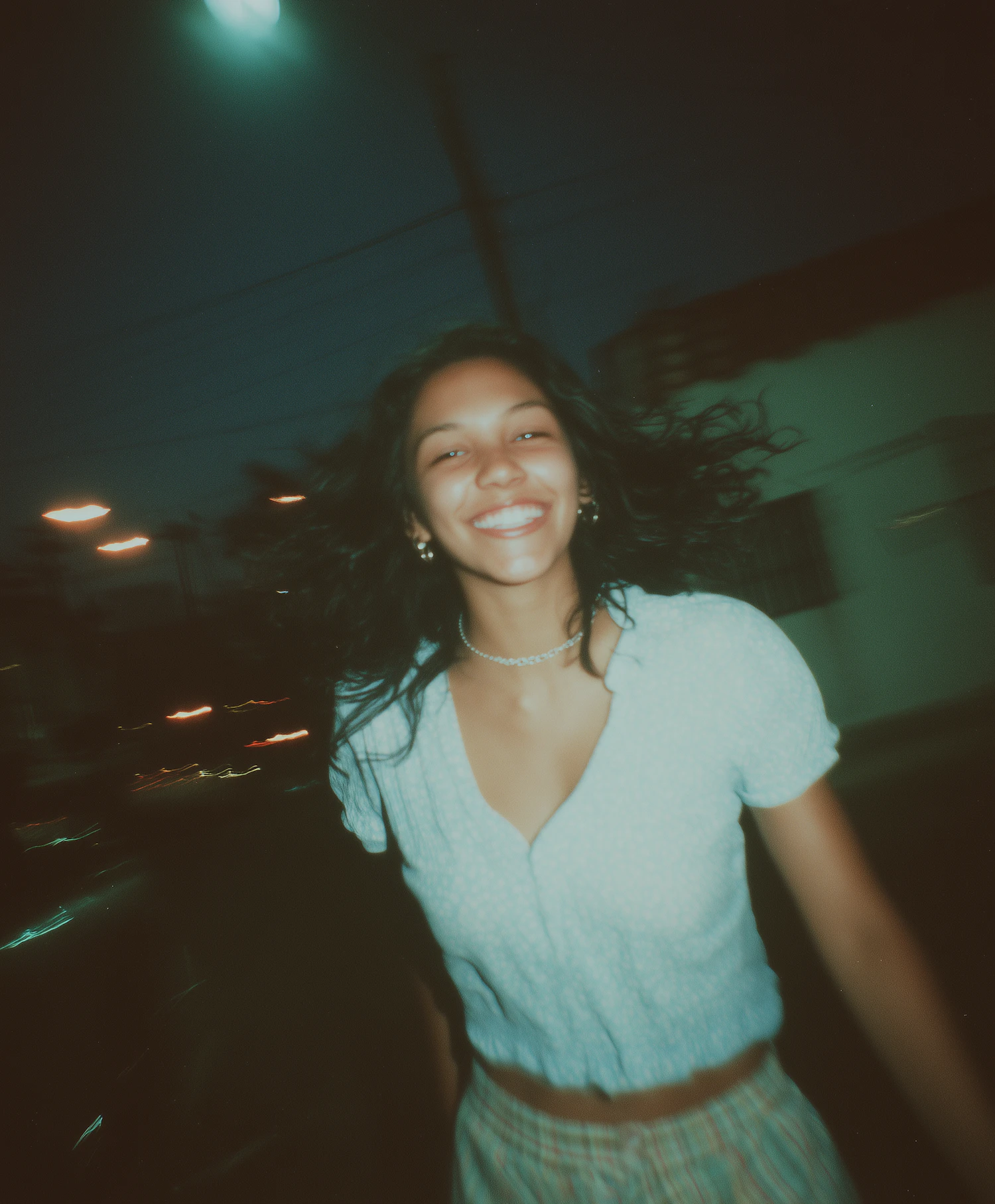A young woman with wavy black hair and a bright smile, wearing a light blue top, captured in motion against a blurred nighttime cityscape.