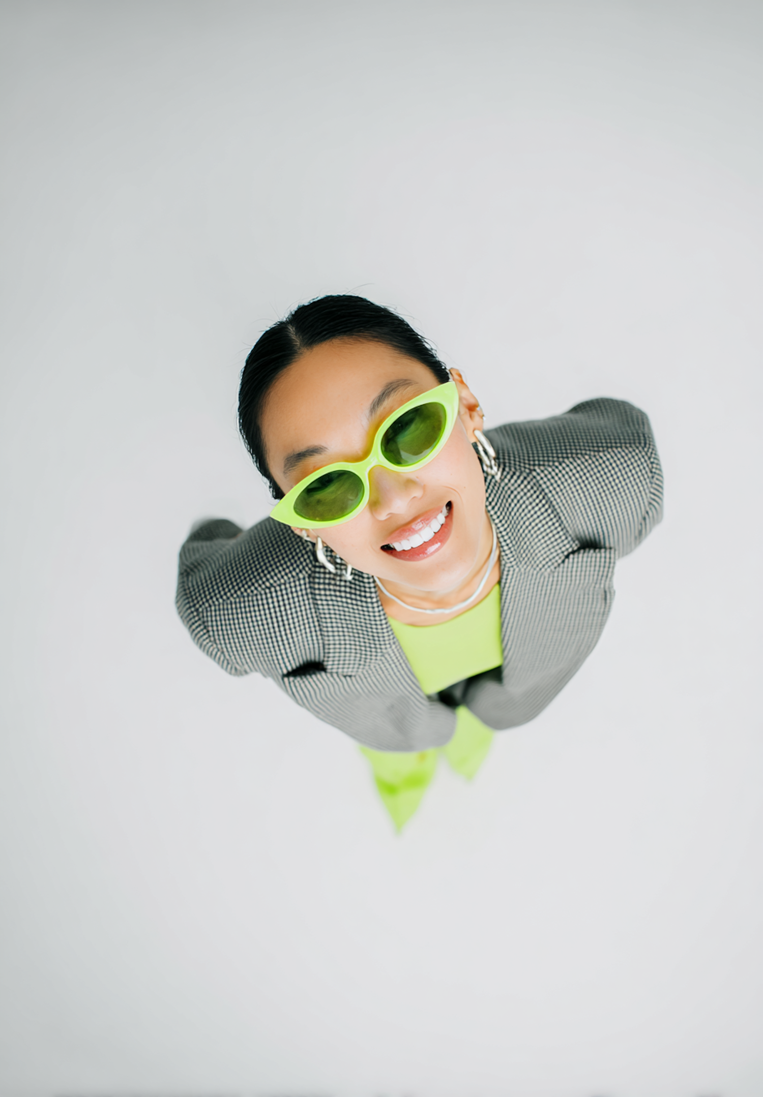 Stylish woman in neon green sunglasses and a checkered blazer, smiling brightly against a clean white background.