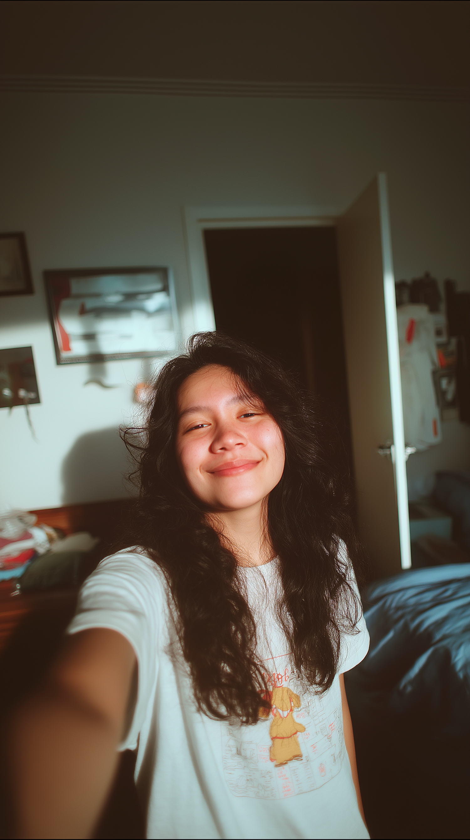 A young woman smiling warmly in a sunlit room, wearing a white t-shirt with a cute design. The cozy atmosphere adds charm to the scene.
