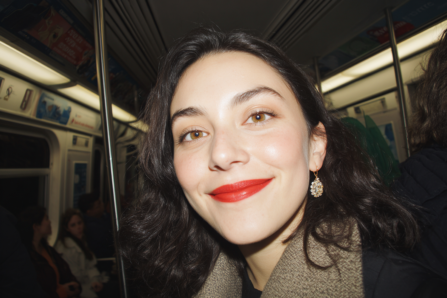 A smiling woman with red lipstick and earrings in a subway setting, captured in a close-up shot with bright lighting.