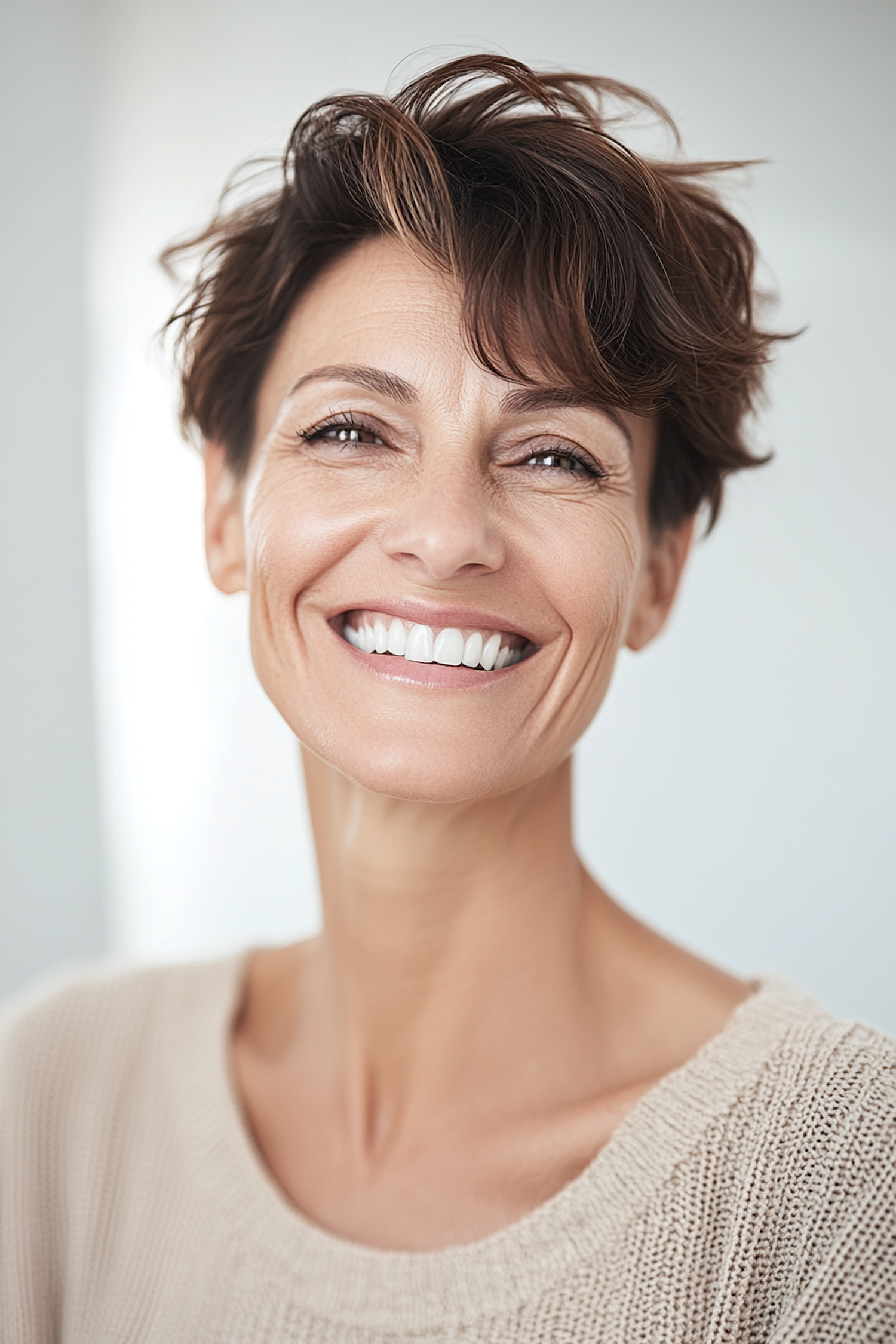 Smiling woman with short brown hair and beige sweater, exuding warmth and joy in soft natural lighting.