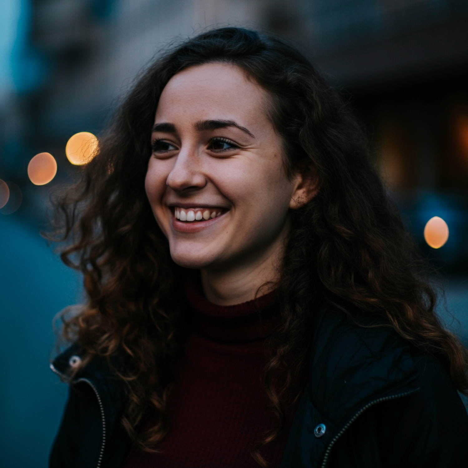 Smiling woman with curly hair in a dark jacket, enjoying an evening in the city with warm bokeh lights in the background.
