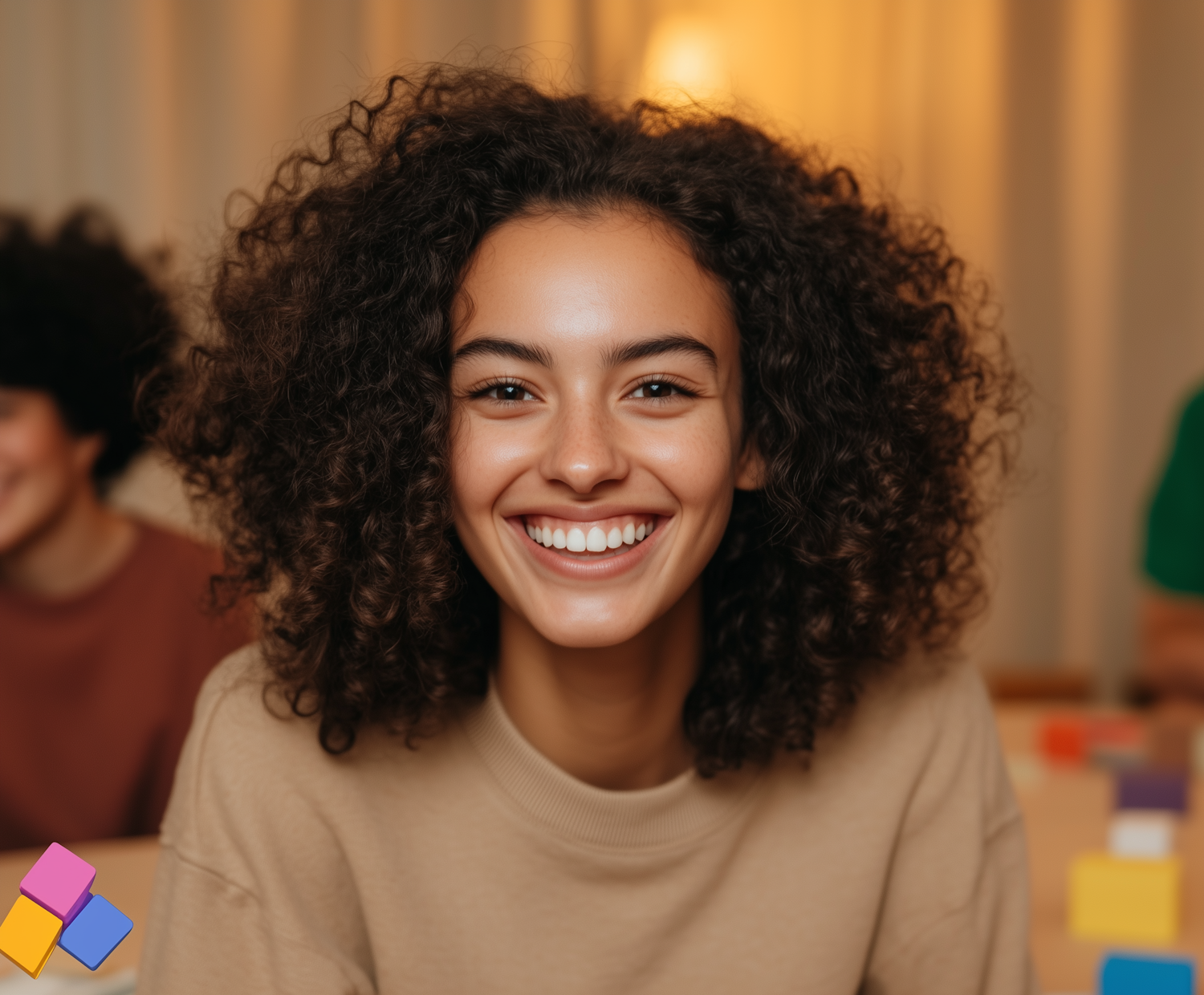 Smiling woman with curly hair in a cozy setting, wearing a beige sweater. Warm lighting and colorful blocks add a playful touch.