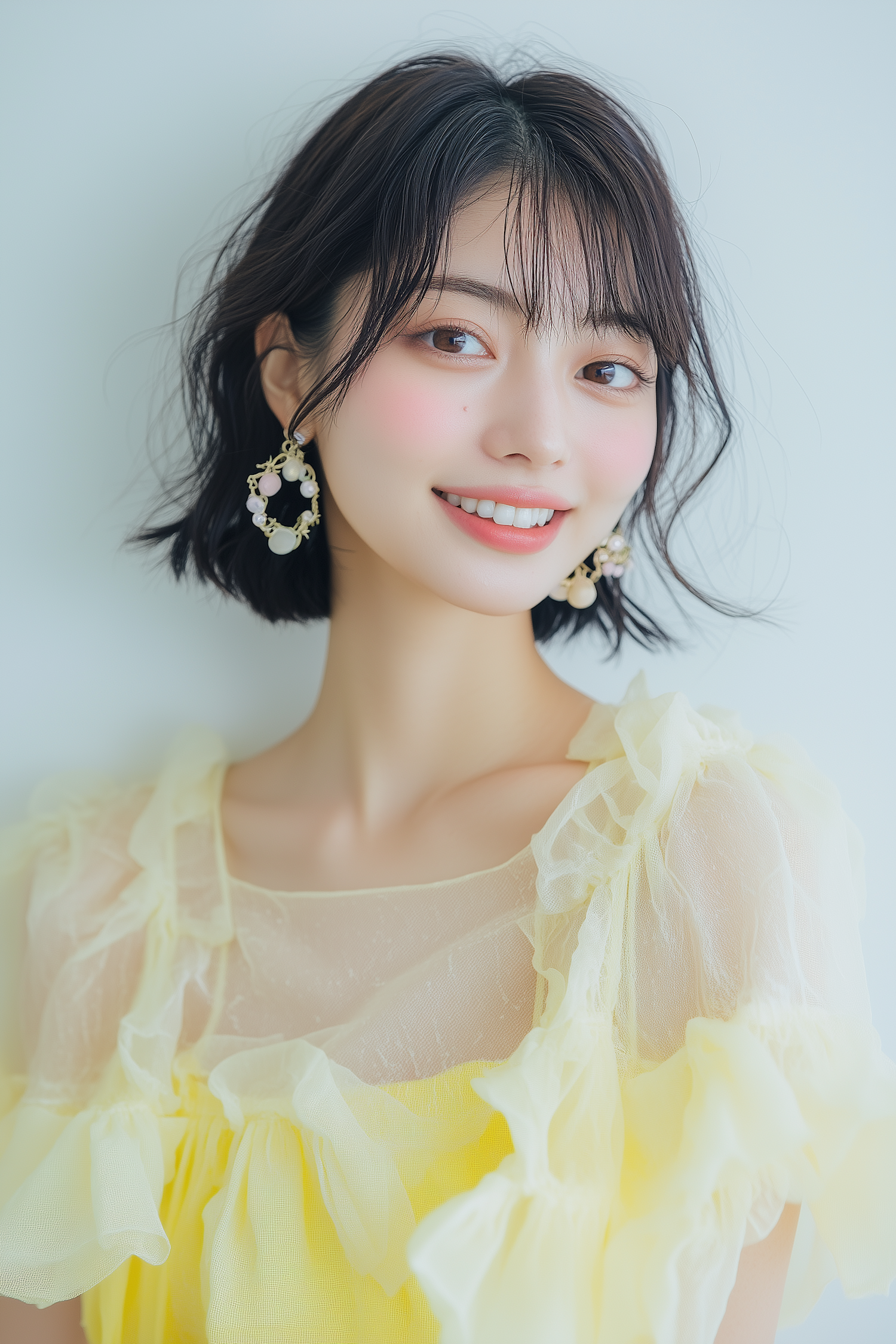 Smiling woman with short dark hair, wearing a yellow ruffled dress and pearl earrings, set against a soft blue background.